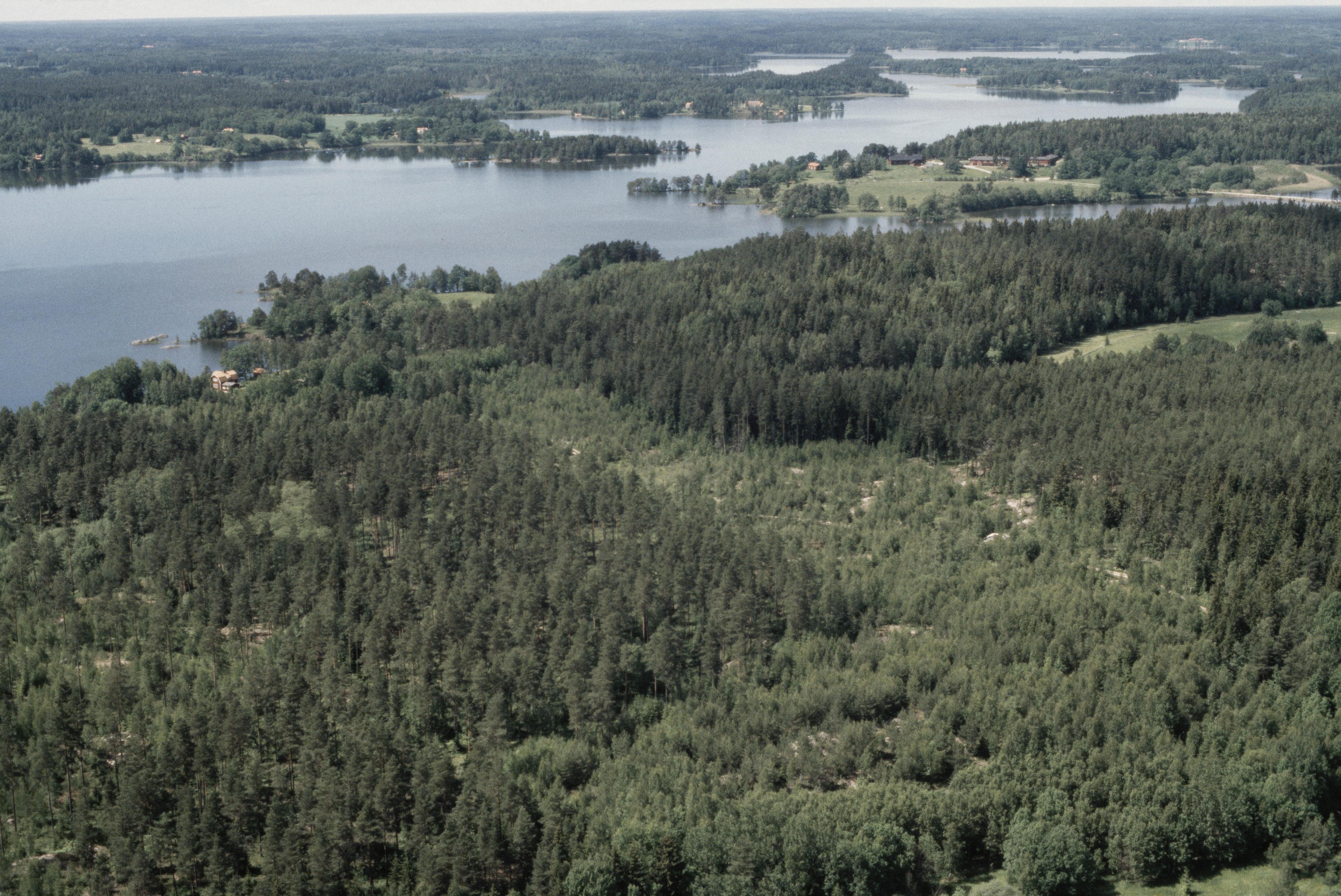 Beskrivning: Hyltingeö vid sjön Båven. Fornborg RAÄnr Hyltinge 62:1 vid bildens mitt. Överby Lillgård uppe till höger. I bildens övre del bron till Aspön och Aspö kursgård i Helgesta socken. Bilden är tagen mot (väderstreck): V