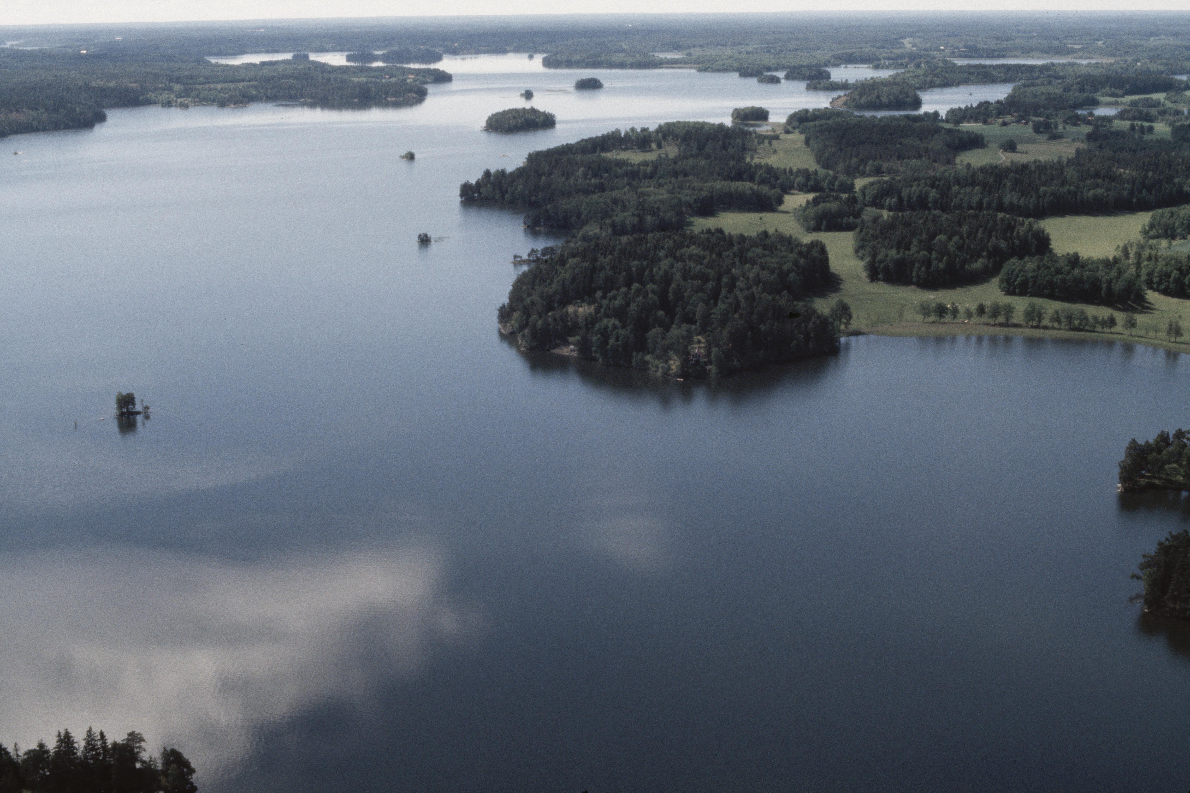 Beskrivning: Vid bildens mitt Björkudden vid Sörbyviken i sjön Båven. På udden fornborg Sörby RAÄnr Helgesta 118:1. Bilden är tagen mot (väderstreck): SV