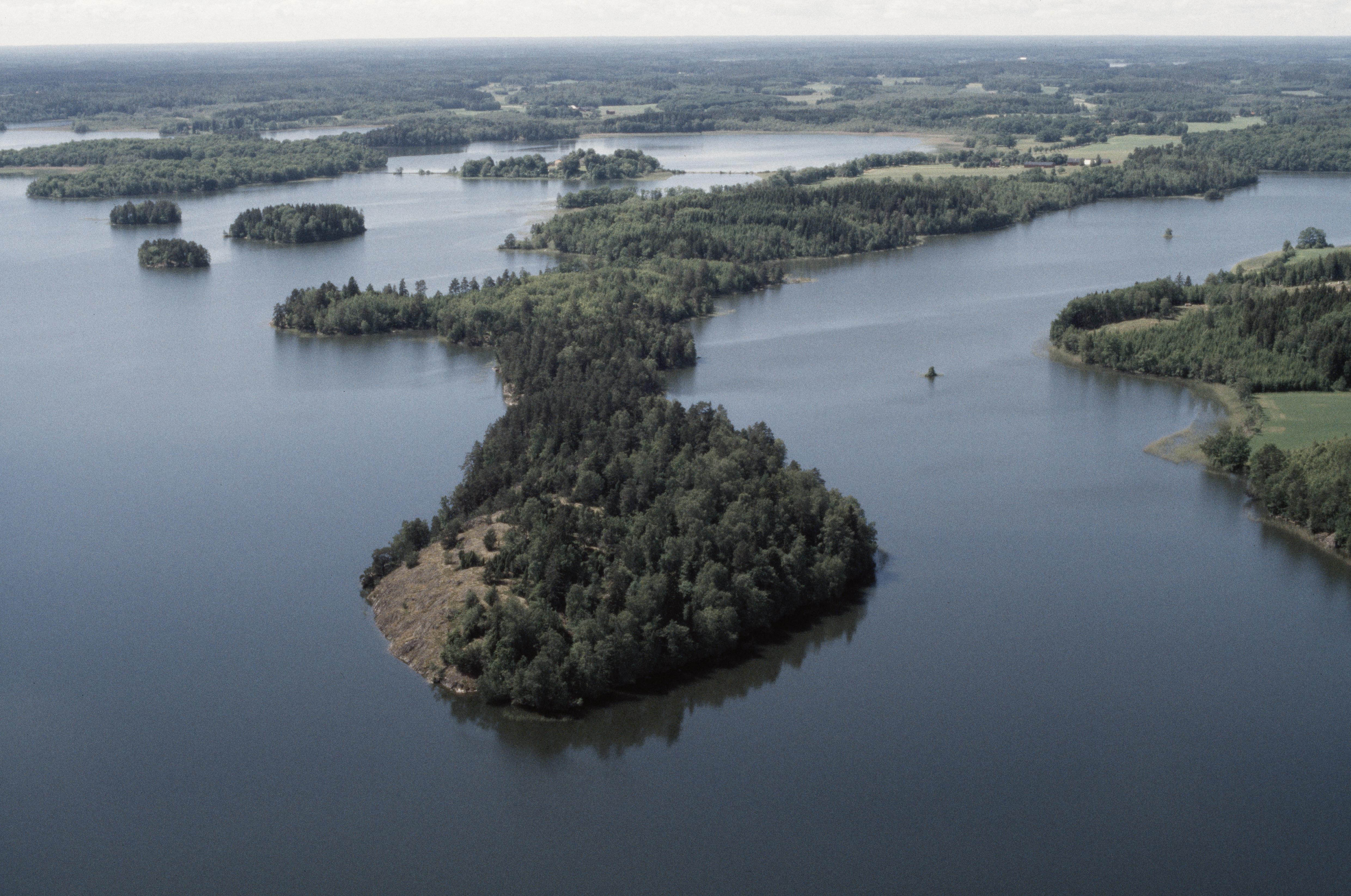 Beskrivning: Djurön i sjön Båven. Fornborg RAÄnr Årdala 124:1 "Fyrstens fornborg". I bildens övre del till vänster Vibyholms slott. Bilden är tagen mot (väderstreck): S