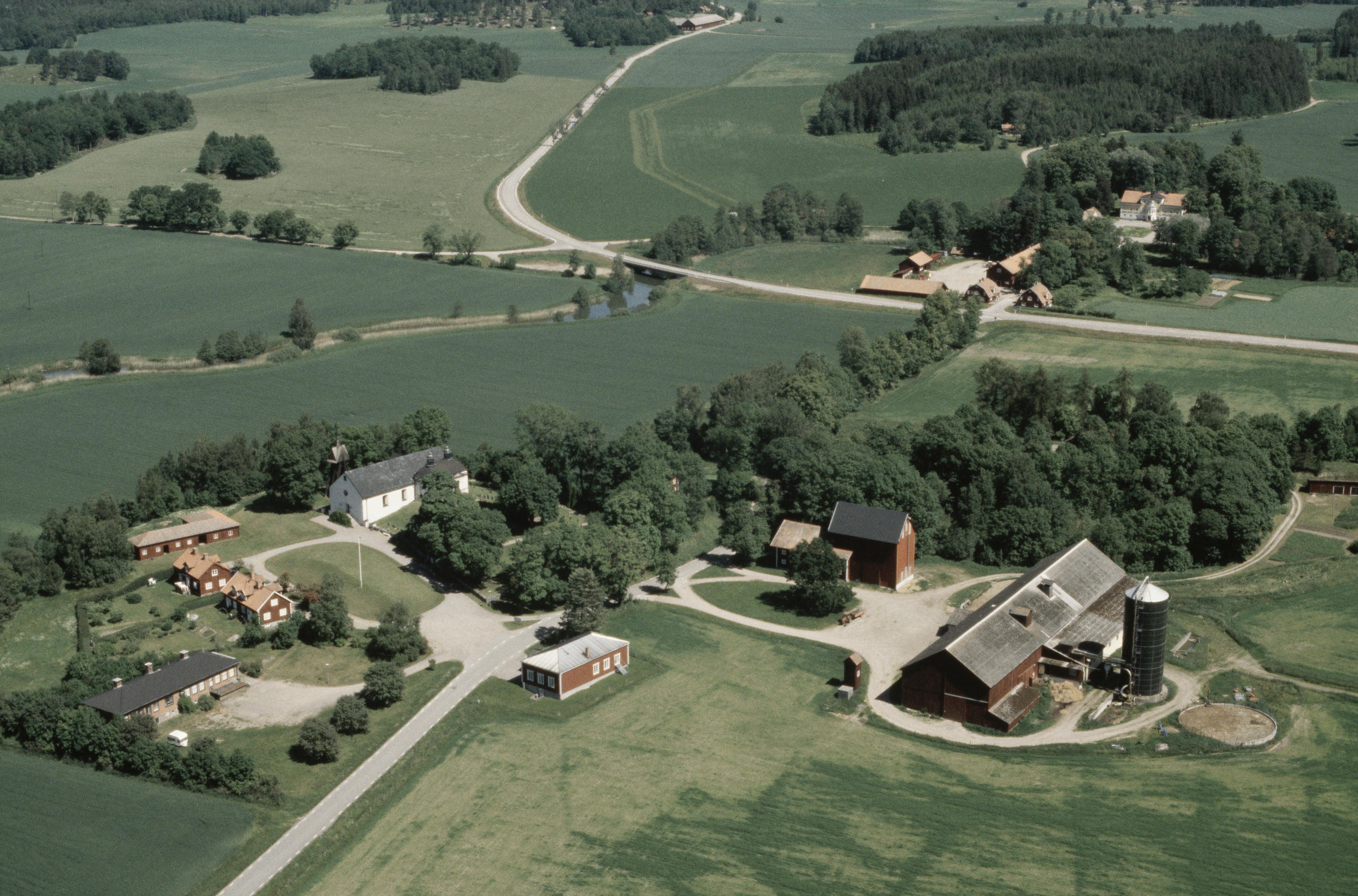 Beskrivning: Husby-Oppunda kyrka till vänster om bildens mitt. Vid kyrkan bytomt RAÄnr Husby-Oppunda 253:1. I bildens övre del Husbyån vid herrgården Husbygård. Bilden är tagen mot (väderstreck): N