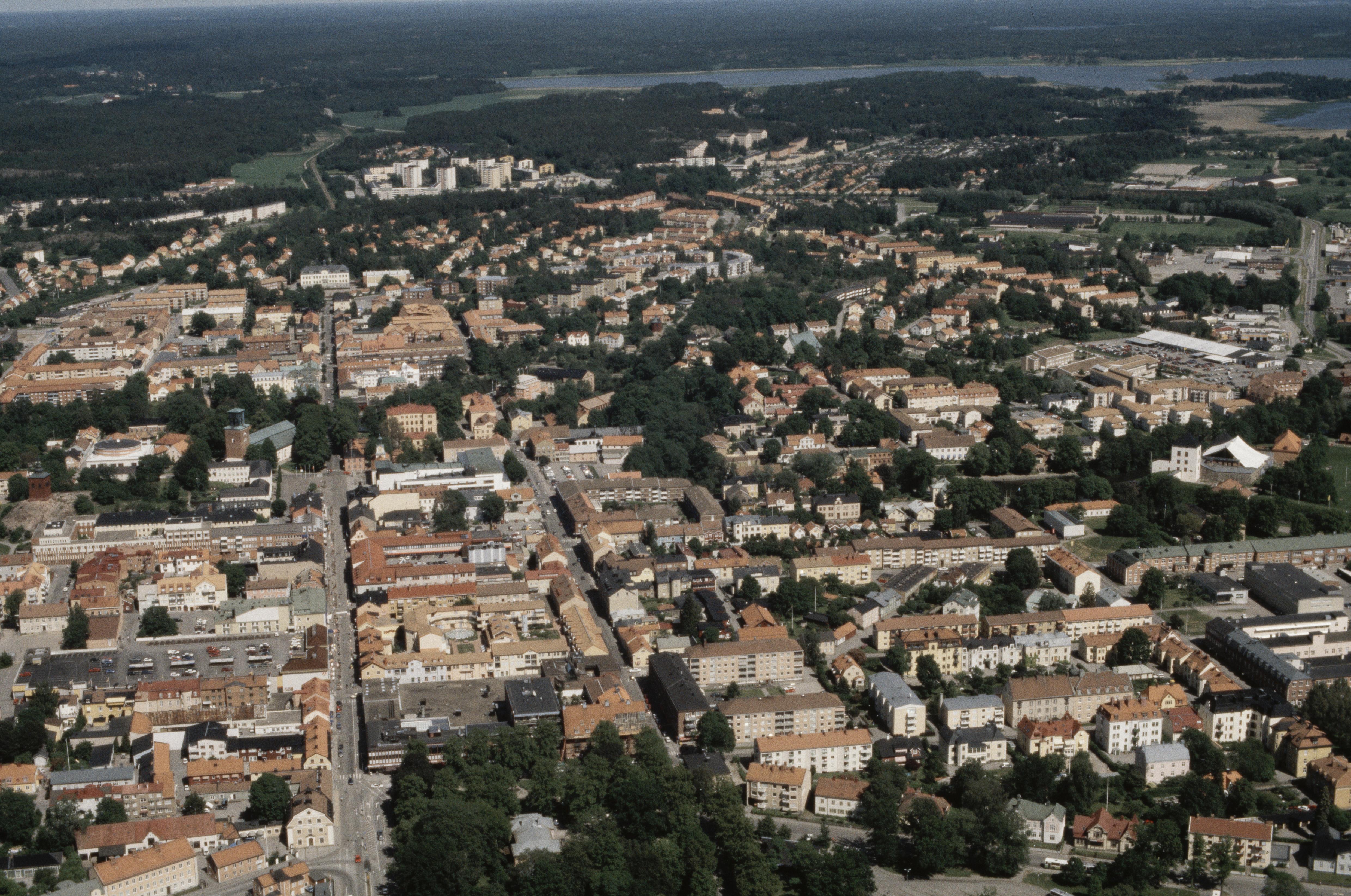 Beskrivning: Nyköpings stad, stadsdelen Väster. Till vänster Västra Storgatan, Stora Torget och Sankt Nicolai kyrka. Till höger Nyköpingshus RAÄnr Nyköping 64:1 vid Nyköpingsån. Bilden är tagen mot (väderstreck): ONO
