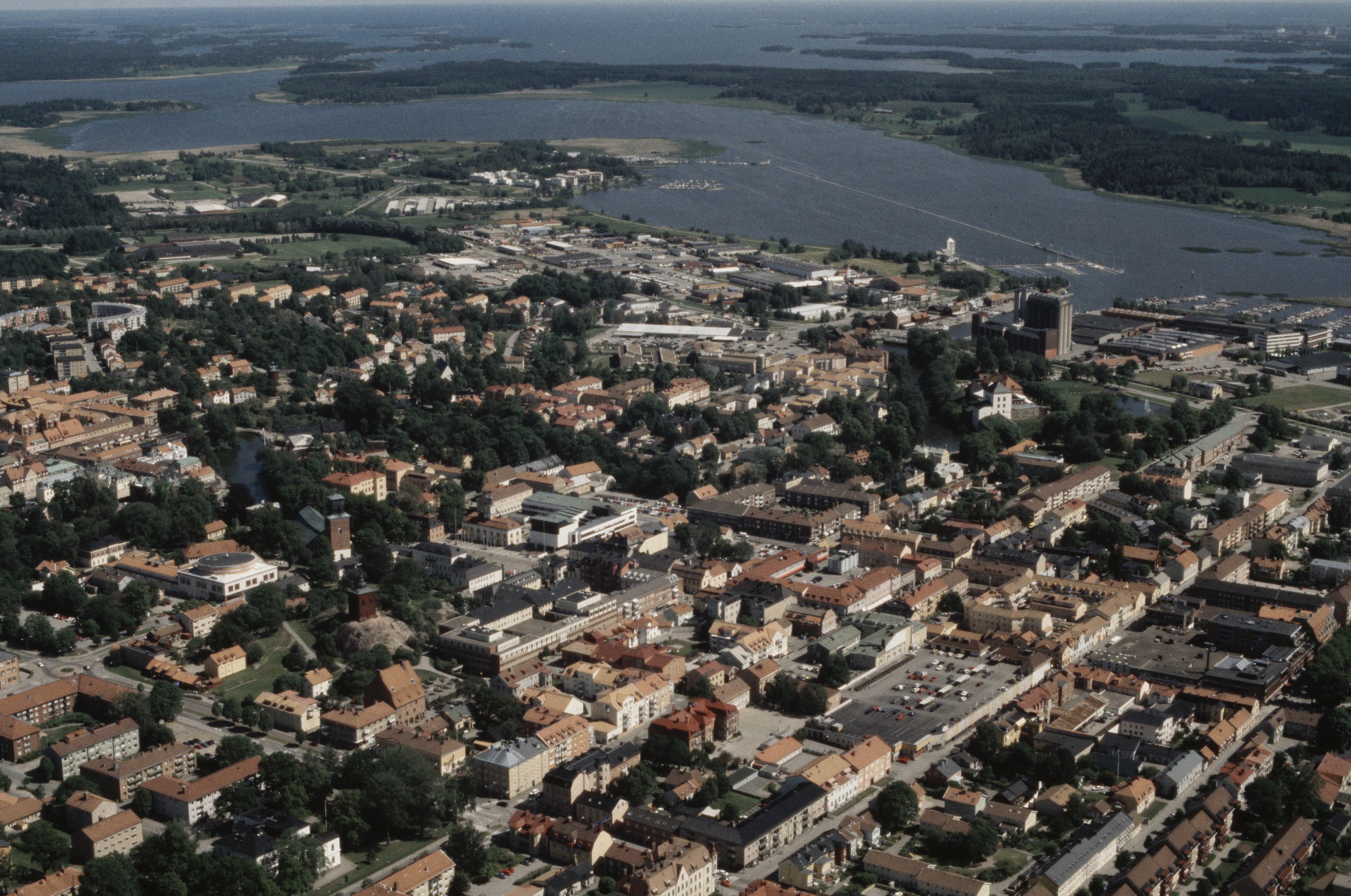 Beskrivning: Nyköpings stad, södra delen. Alla Helgona kyrka till vänster om bildens mitt. Sankt Nicolai kyrka vid Stora Torget nere till vänster. Till höger borgen Nyköpingshus RAÄnr Nyköping 64:1 vid Nyköpingsån. Bilden är tagen mot (väderstreck): SO