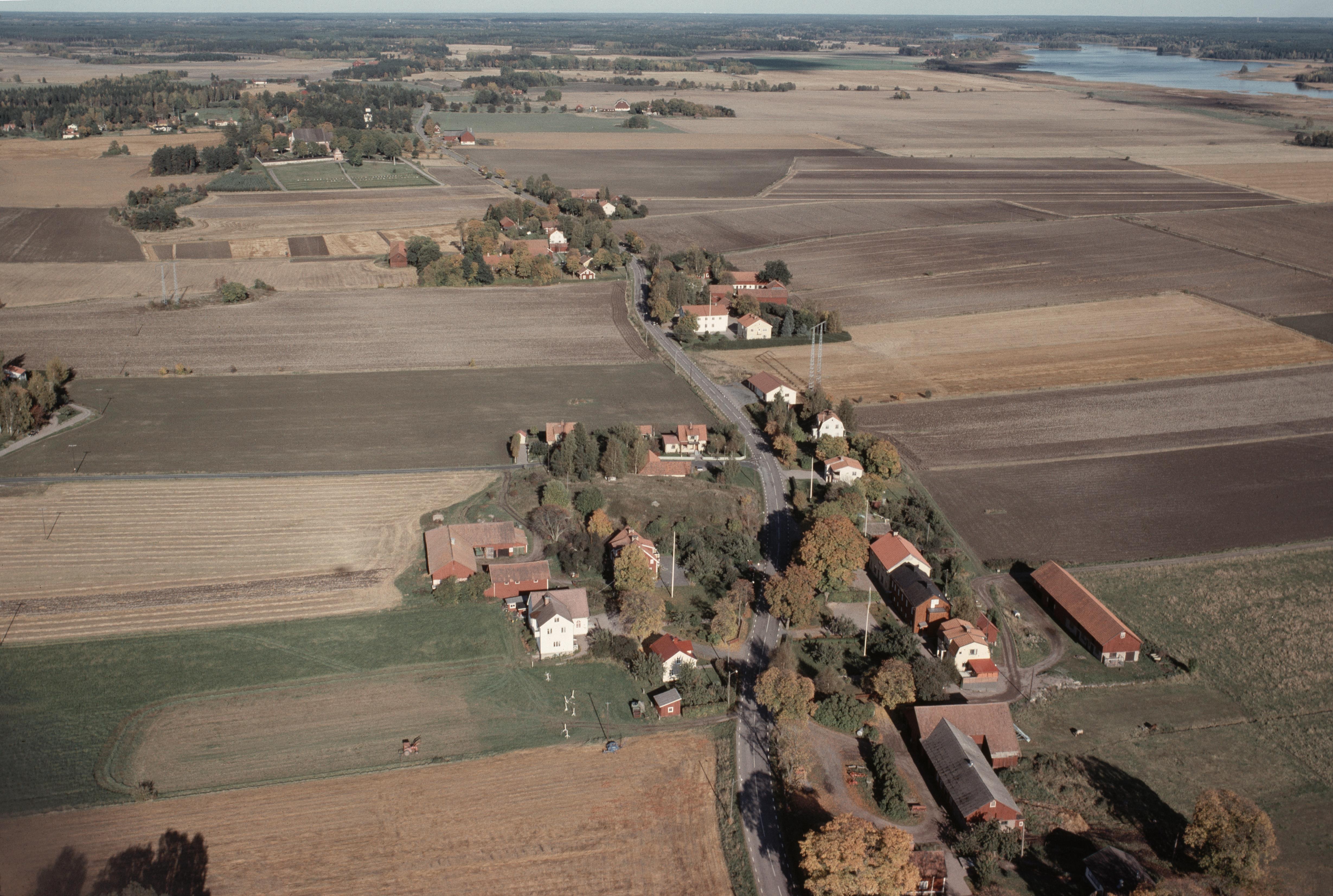 Beskrivning: Karby med gravfält RAÄnr Vendel 6:1 vid bildens mitt. Vendels kyrka till vänster och Vendelsjön till höger i bildens övre del. Bilden är tagen mot (väderstreck): NO