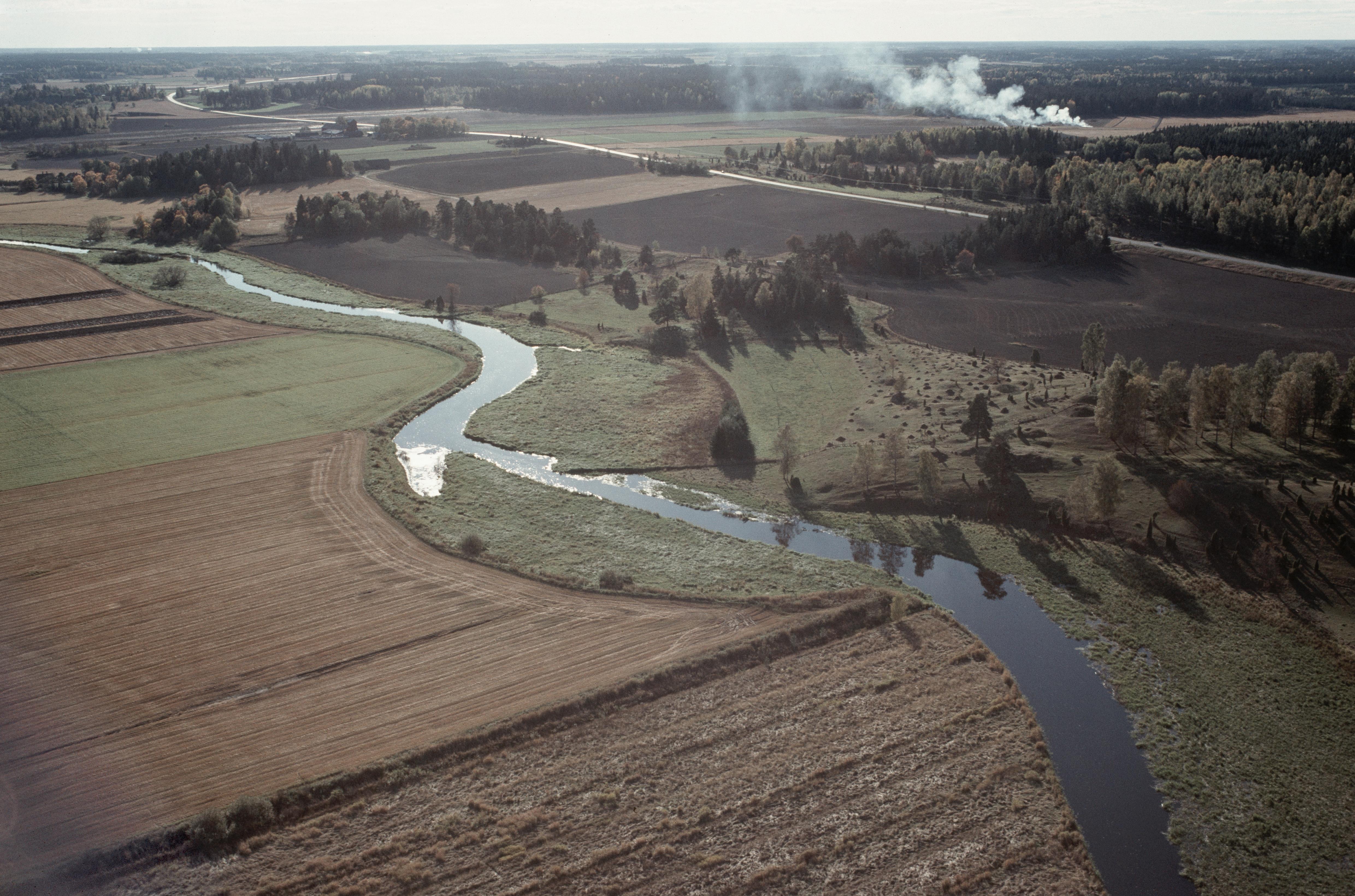 Beskrivning: Fyrisån vid Ekeby i Lena. Vid bildens mitt gravfält RAÄnr Lena 109:1 med husgrund Lena 380, bytomt Lena 575 och 835 m.fl. Bilden är tagen mot (väderstreck): SV