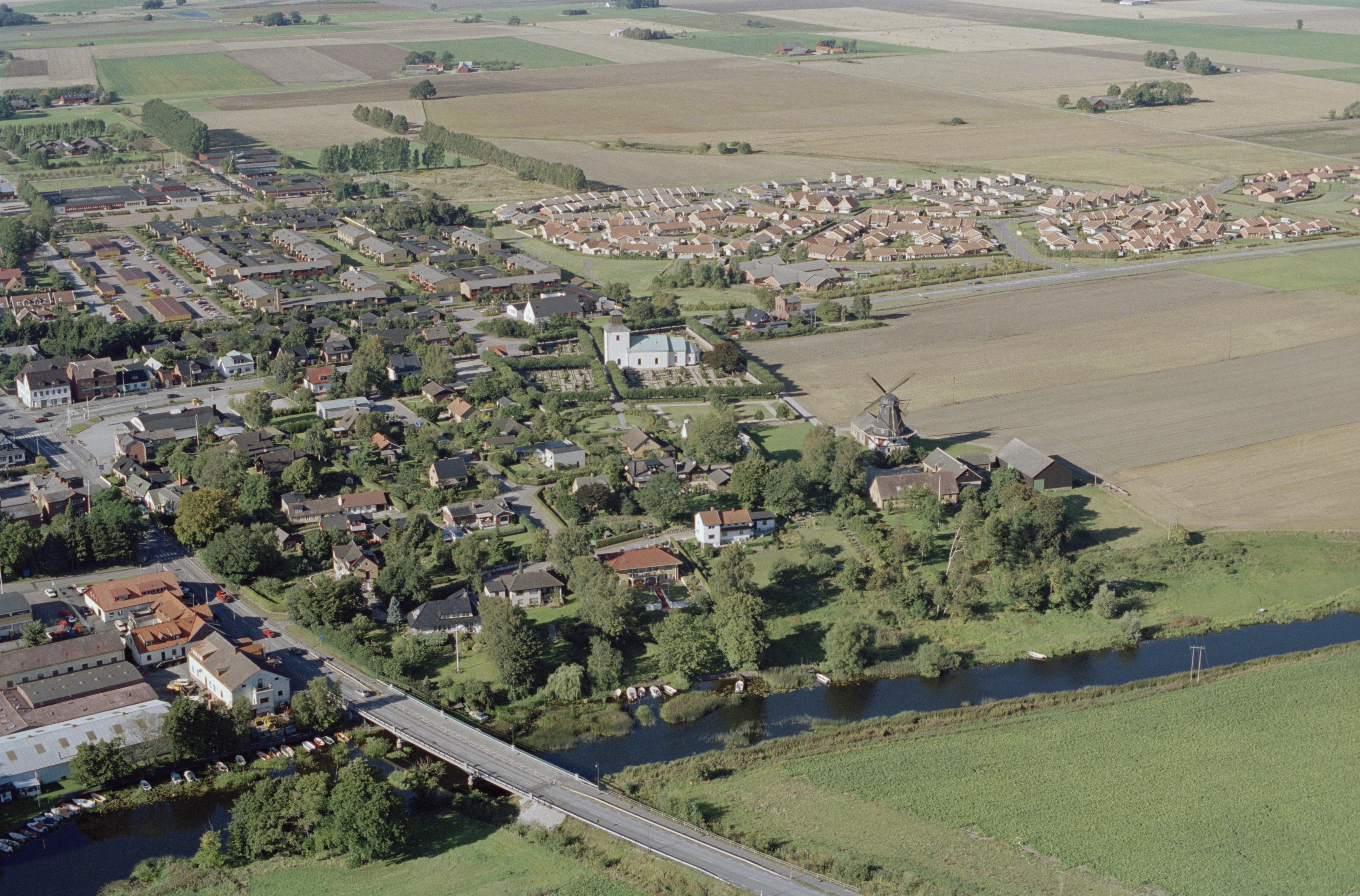Beskrivning: Väderkvarn och Löddeköpinge kyrka i tätorten Löddeköpinge. I bildens nedre del Lödde å. Bilden är tagen mot (väderstreck): N