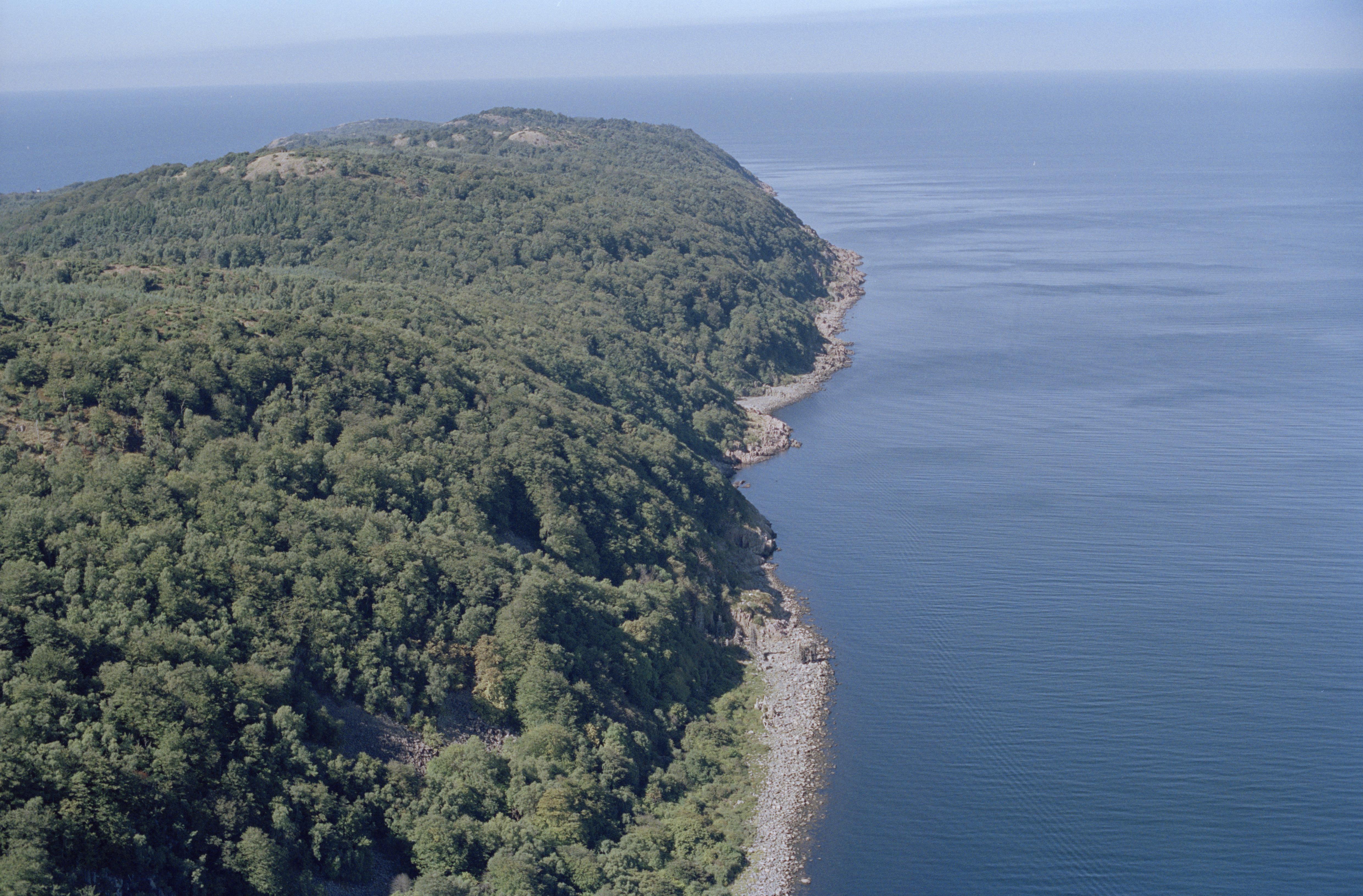 Beskrivning: Östra Kullaberg. I skogsområdet vid Håkull, Gregers backar med färdväg RAÄnr Brunnby 348, Valdemarsgrottan och Håle stenar m.fl. Bilden är tagen mot (väderstreck): VNV