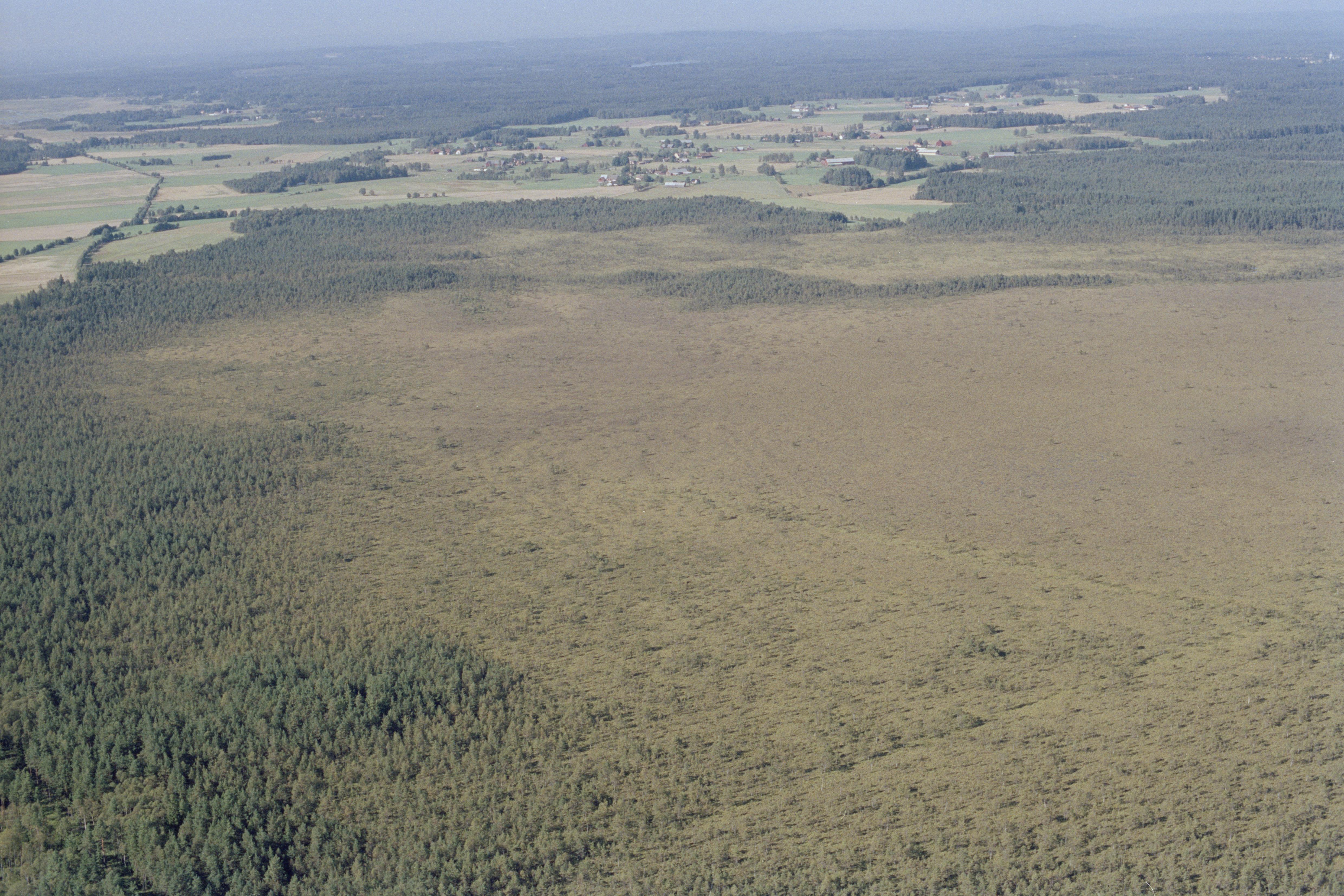 Beskrivning: Draftinge mosse vid gränsen mellan socknen Ås och Torskinge. Draftinge by i bildens övre del. Finnvedens folkland. Bilden är tagen mot (väderstreck): N