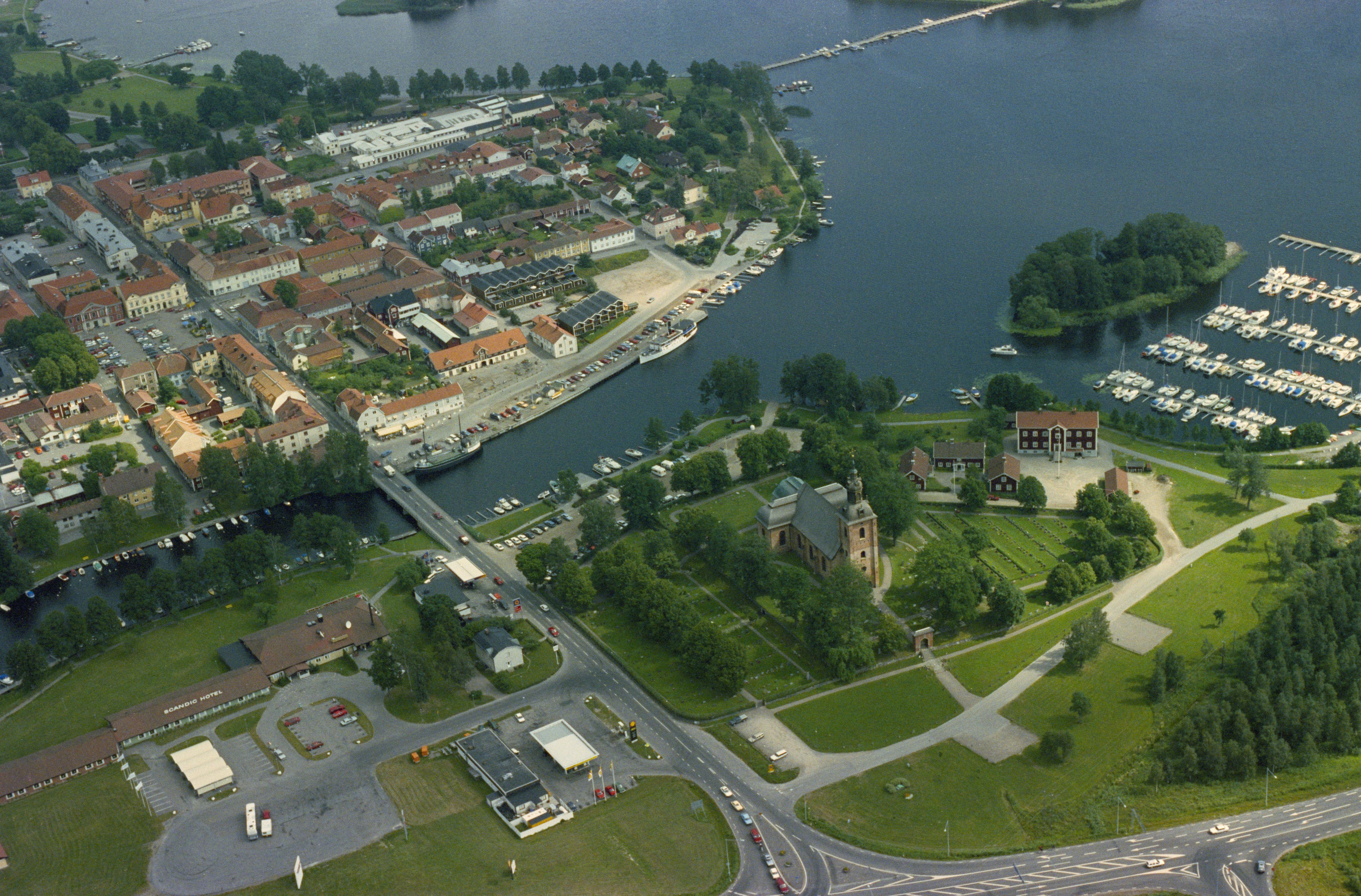 Beskrivning: Askersunds tätort vid Sundet och sjön Alsen. Askersunds Landskyrka nere till höger. Bilden är tagen mot (väderstreck): SO