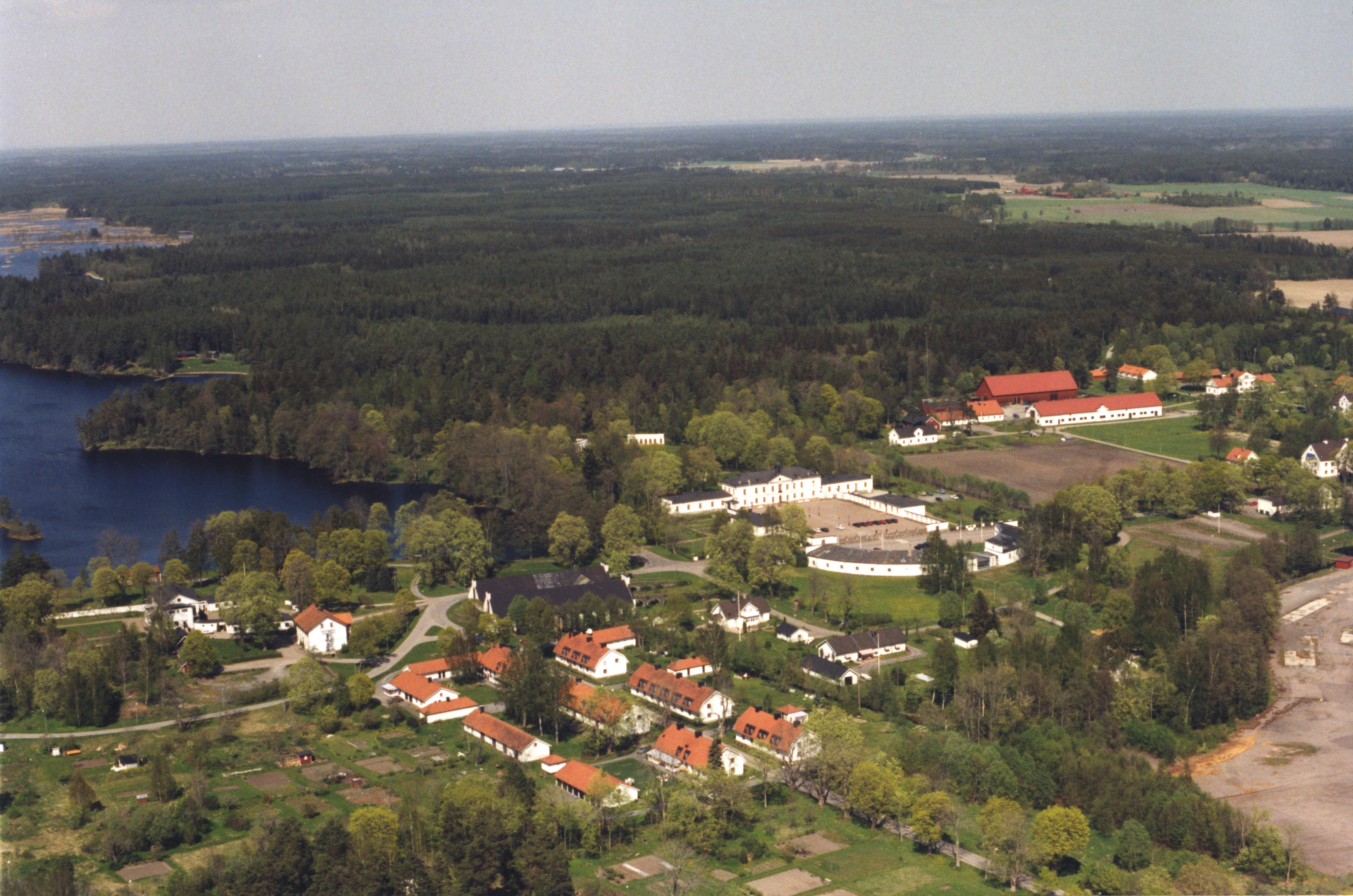 Beskrivning: Gimo bruk RAÄnr Skäfthammar 76:1-3 vid Gimo damm och Olandsåns dalgång. Vid bildens mitt Gimo herrgård. Uppe i högra hörnet Olandsån som markerar gränsen mot socknet Hökhuvud. Bilden är tagen mot (väderstreck): NNO