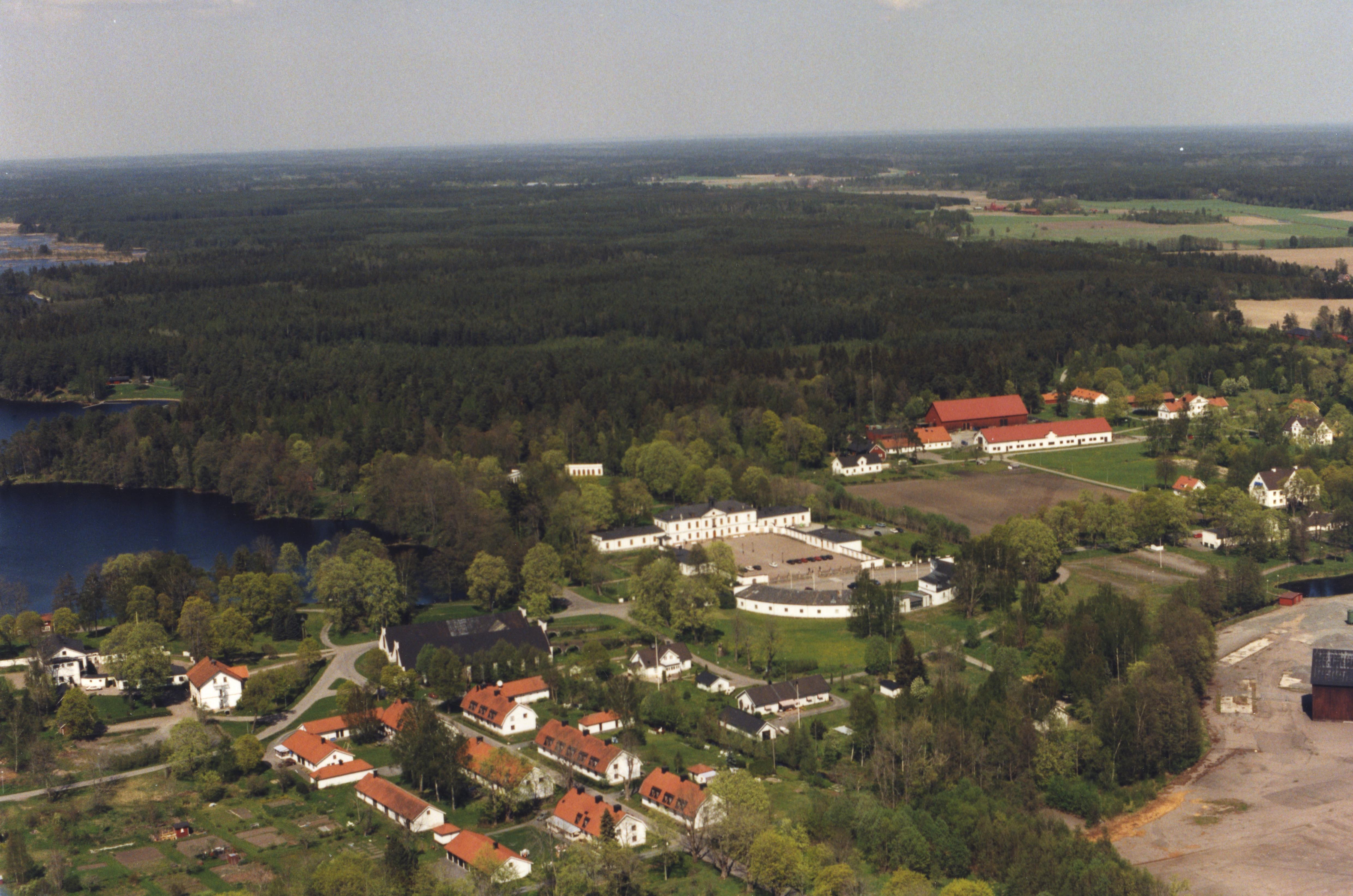Beskrivning: Gimo bruk RAÄnr Skäfthammar 76:1-3 vid Gimo damm och Olandsåns dalgång. Vid bildens mitt Gimo herrgård. Uppe i högra hörnet Olandsån som markerar gränsen mot socknet Hökhuvud. Bilden är tagen mot (väderstreck): NNO