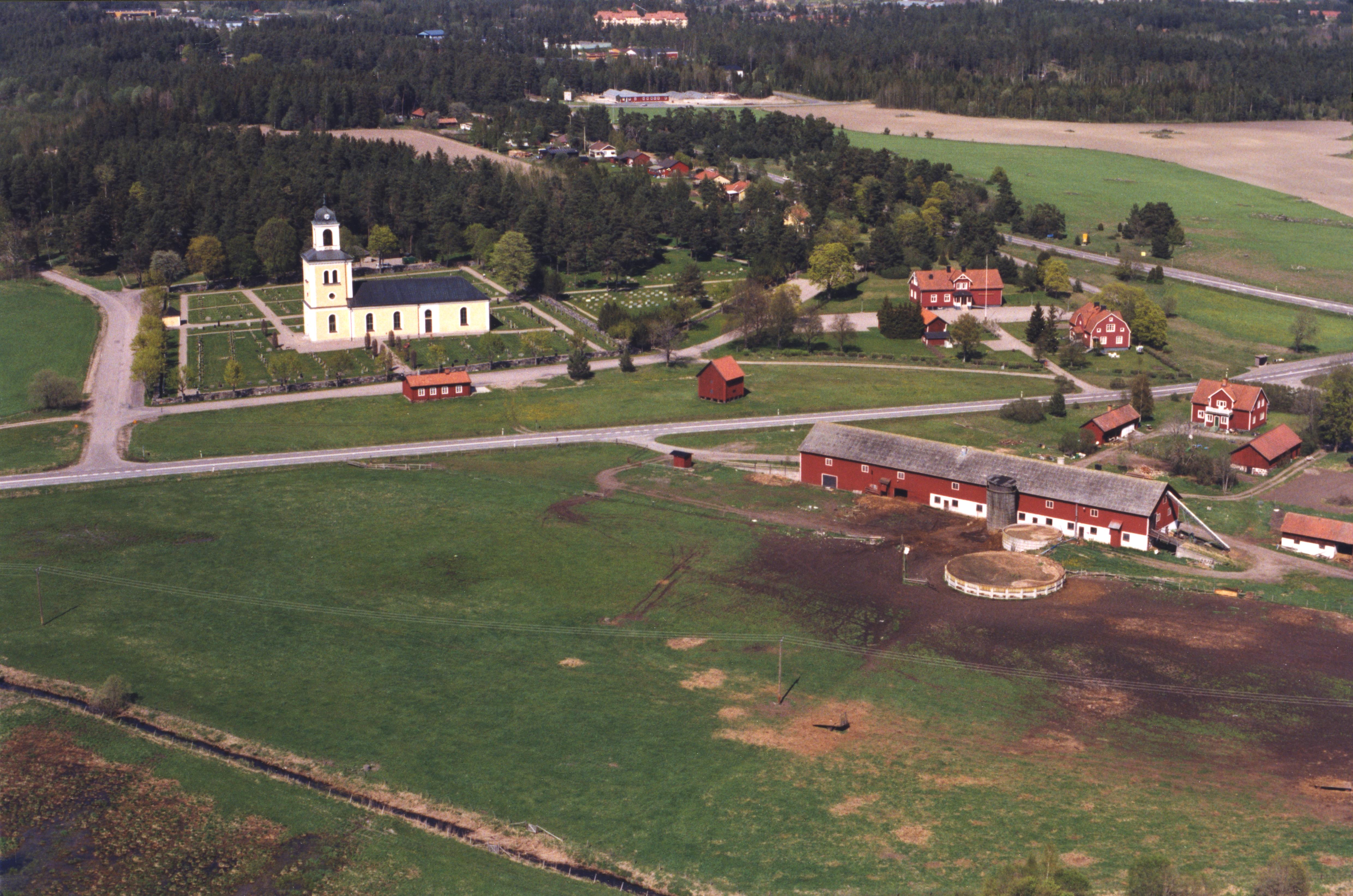 Beskrivning: Uppe till vänster Börstils kyrka vid ån Norsdiket. Nere till vänster bytomt RAÄnr Börstil 268:1. Bilden är tagen mot (väderstreck): NNO