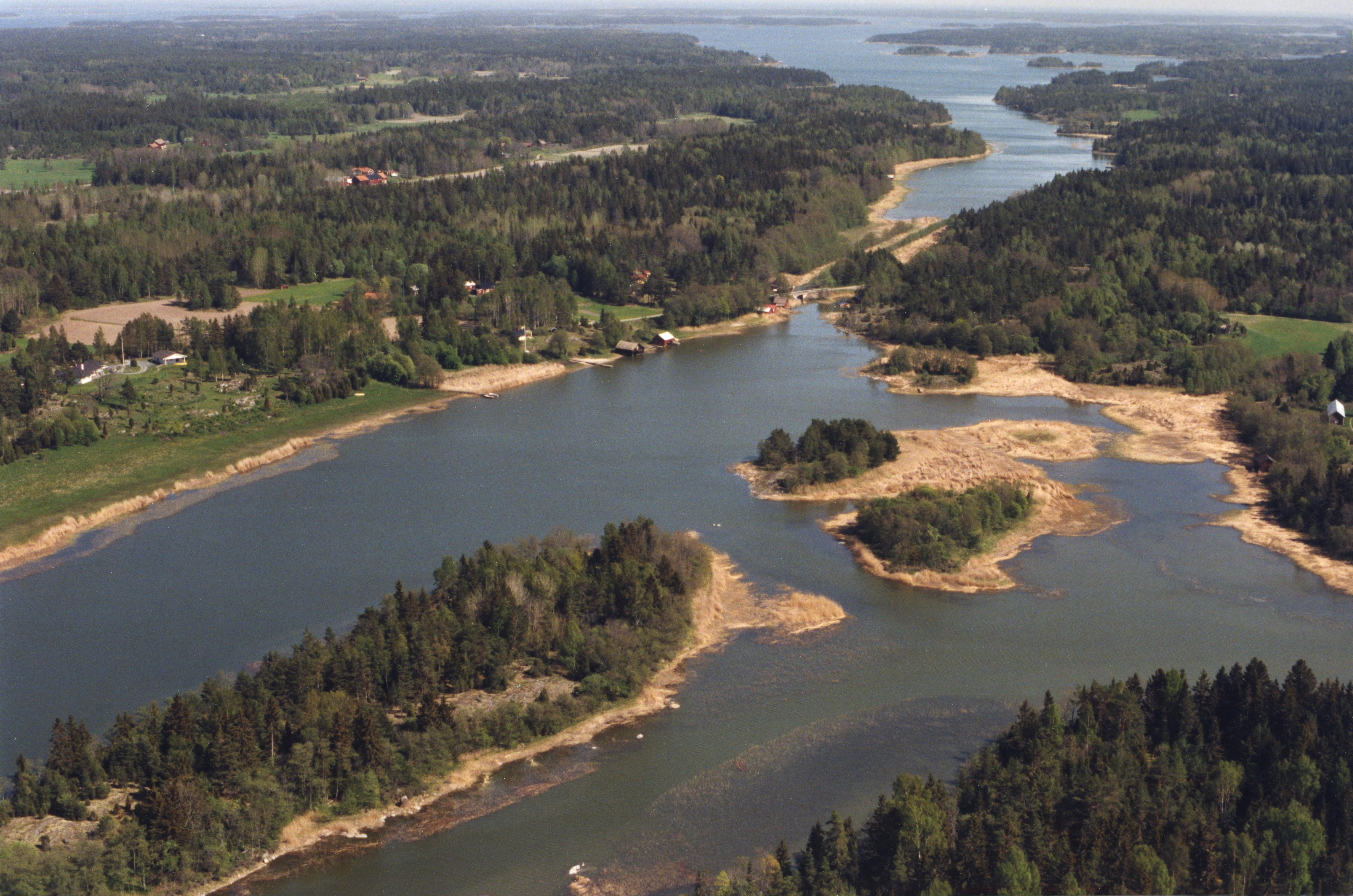 Beskrivning: Östhammarsfjärden mot Raggaröfjärden. Söderön till vänster och Tvärnö uppe till höger. Till vänster Tuskö by. Över bildens mitt Gruvskäret i Tuskösundet med gruvområde RAÄnr Börstil 256:1. Hargs socken i bildens övre del till höger. Bilden är tagen mot (väderstreck): OSO