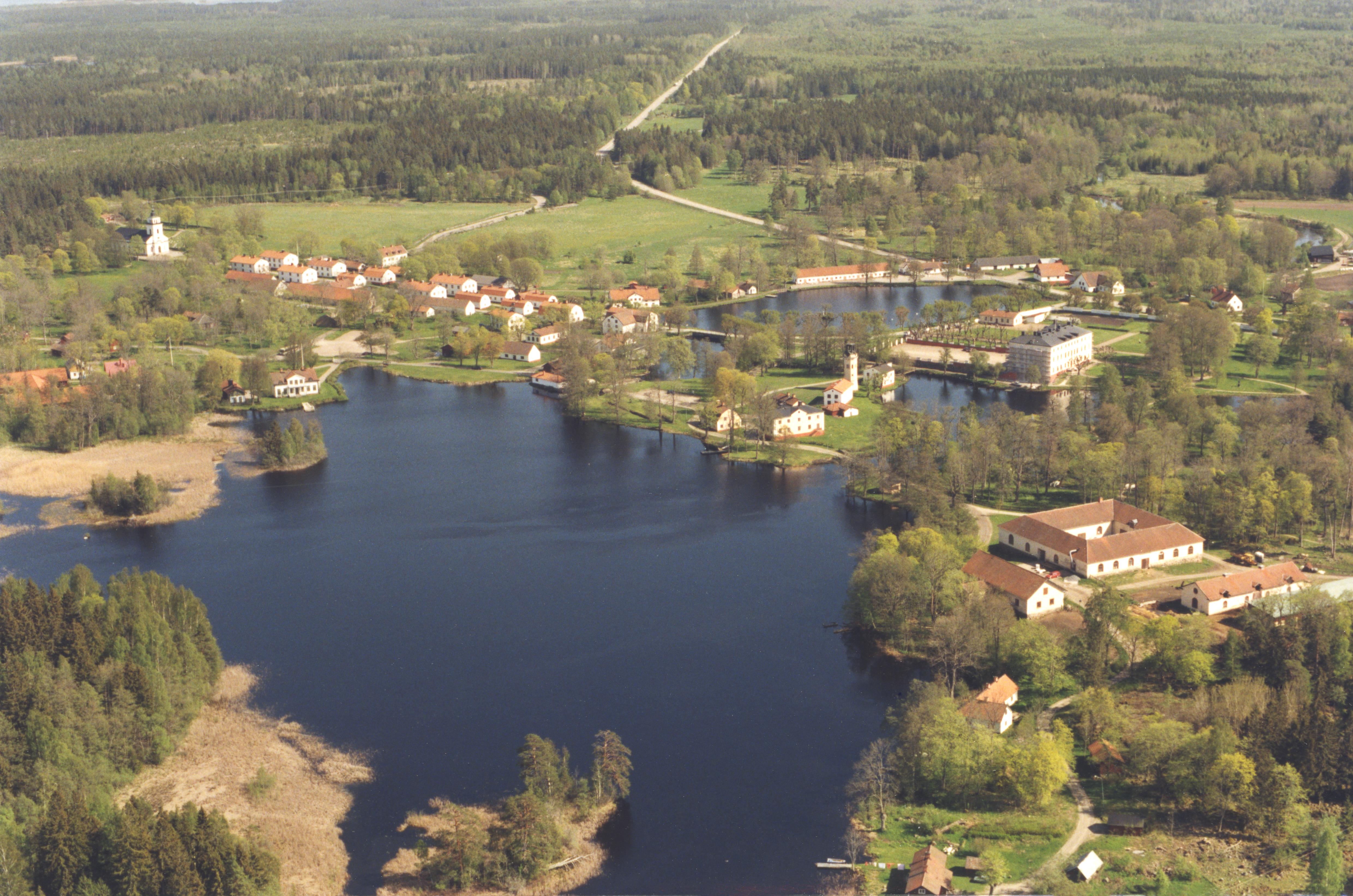 Beskrivning: Forsmarks bruk RAÄnr Forsmark 65:1 vid Bruksdammen / Gimo damm och Forsmarksån. Uppe till vänster Forsmarks kyrka, till höger om bildens mitt Forsmarks herrgård. Bilden är tagen mot (väderstreck): SO