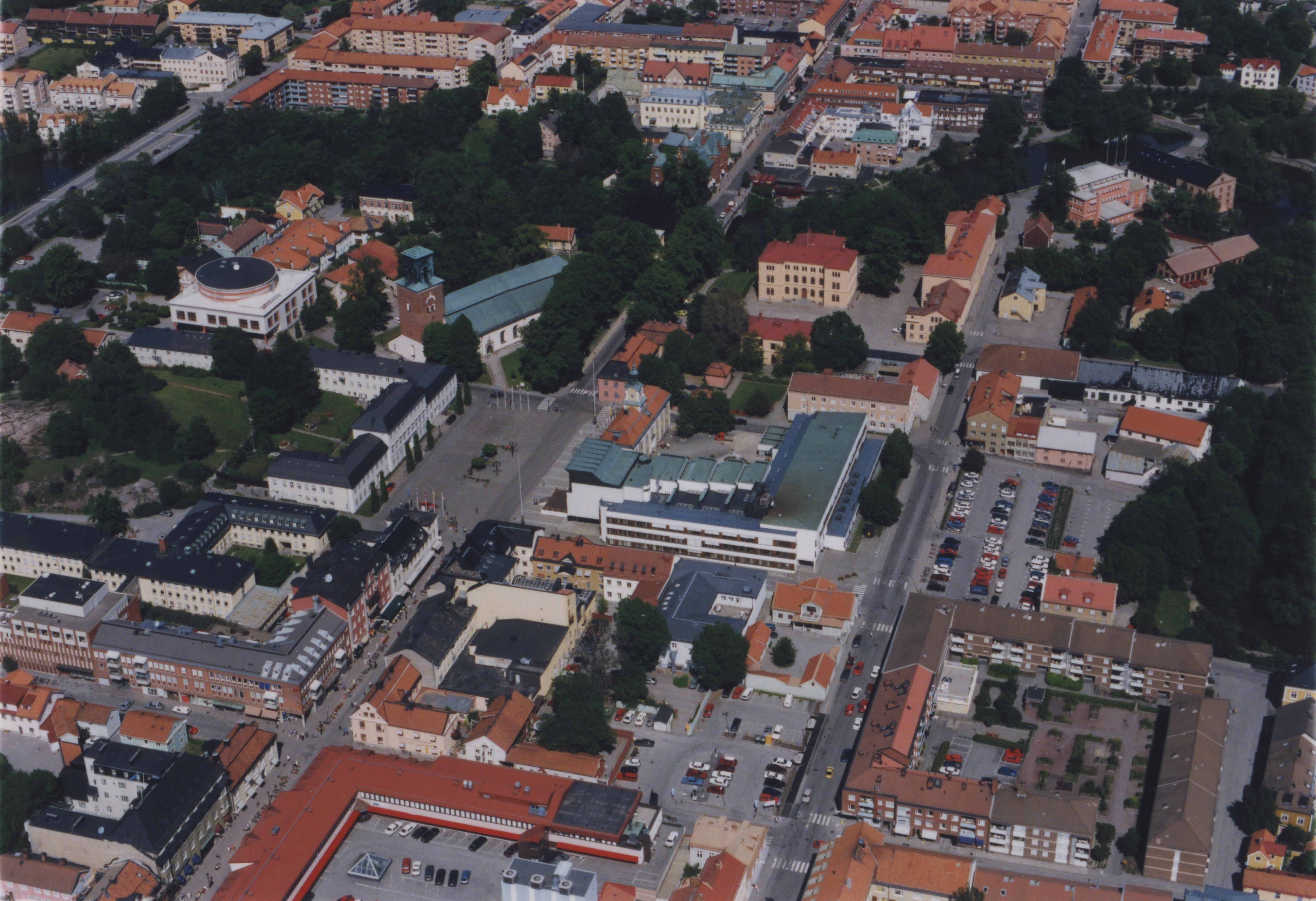 Beskrivning: Nyköpings stad, stadsdelen Väster. Stora Torget, Sankt Nicolai kyrka och Nyköpingsån. Bilden är tagen mot (väderstreck): NO