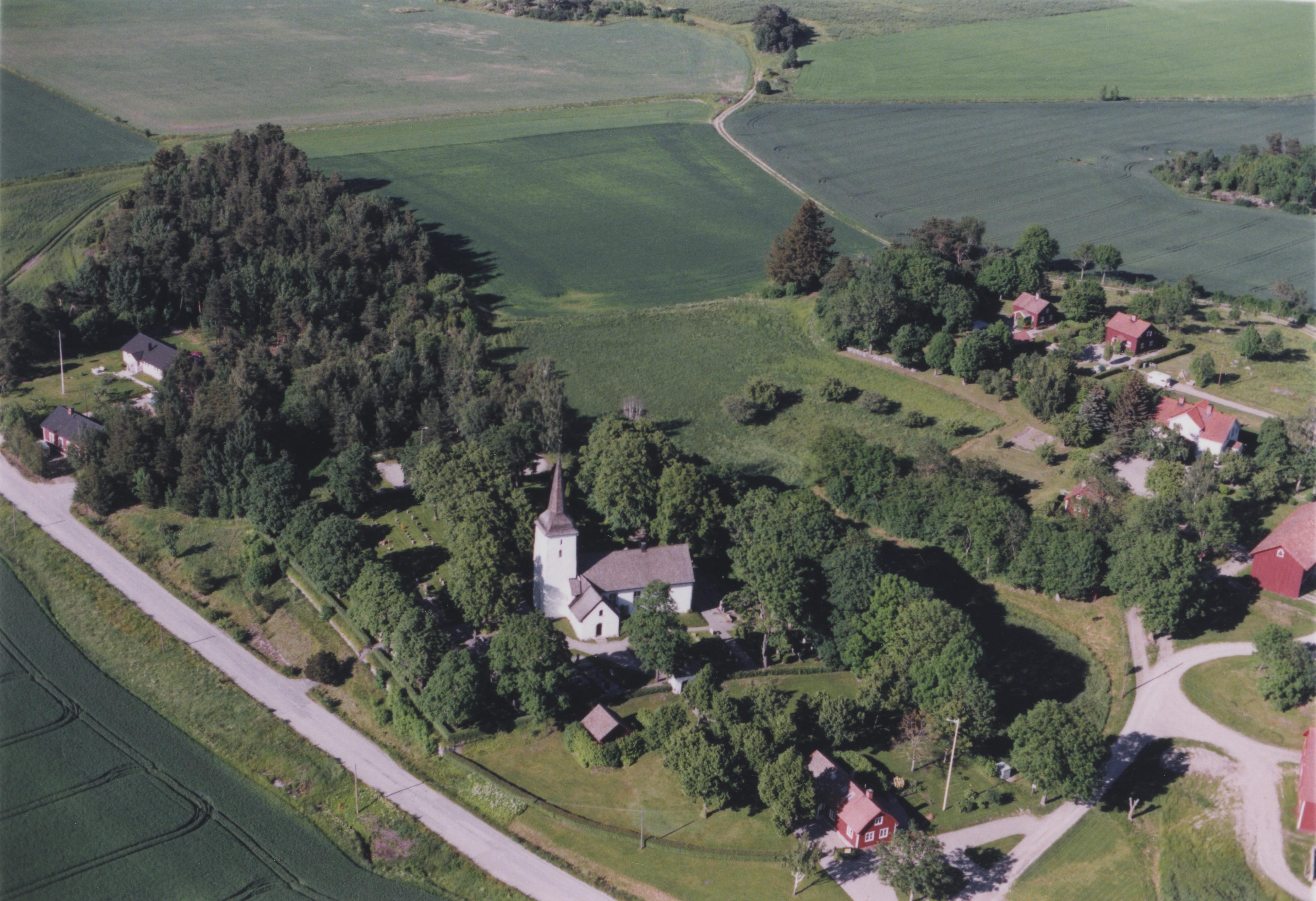 Beskrivning: Vallby kyrka och kyrkby. Bilden är tagen mot (väderstreck): NO
