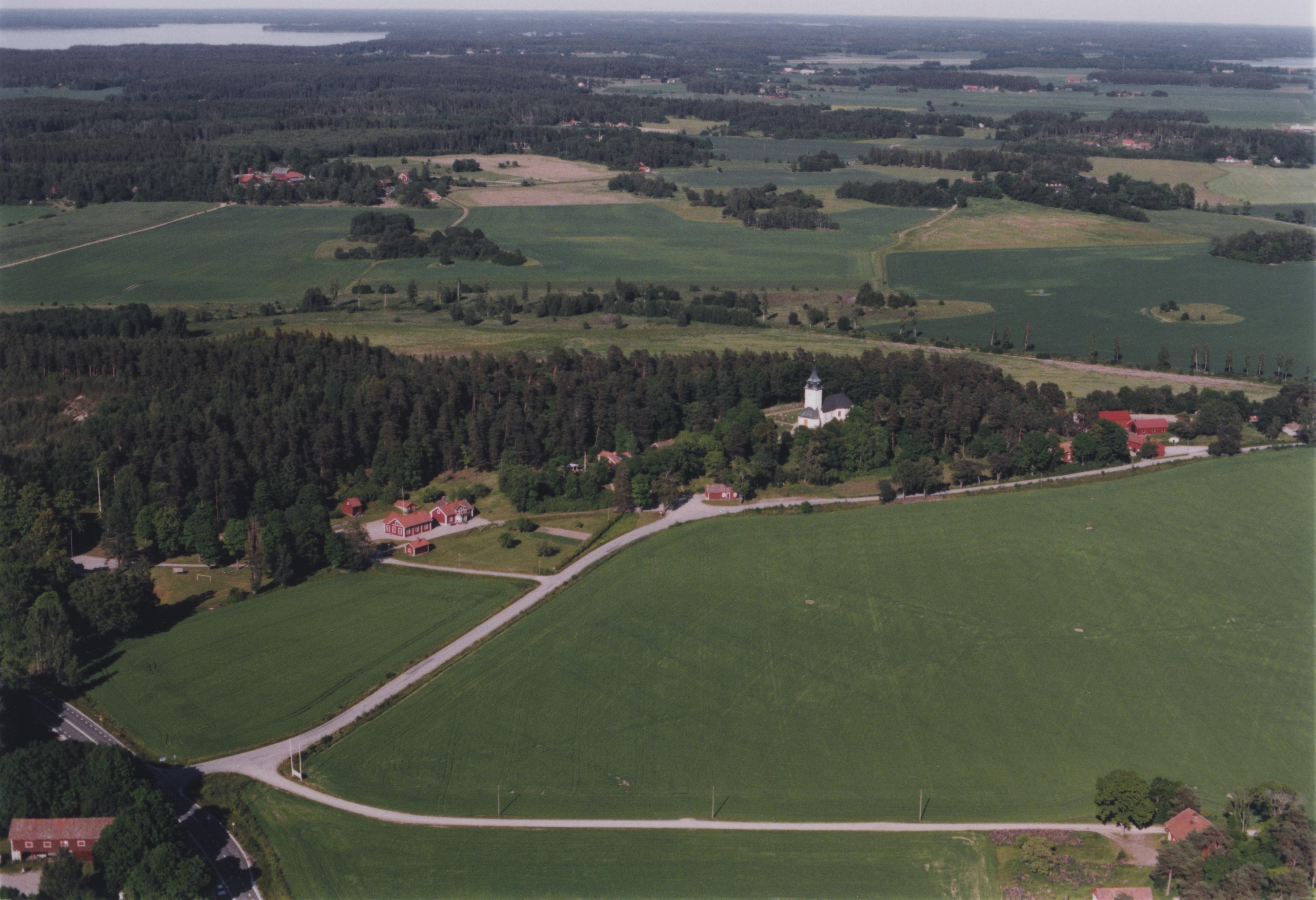 Beskrivning: Sundby kyrka vid Sundbyåsen och Ramsundsån. Ån markerar gränsen mot socknet Jäder (i bildens övre del). Bilden är tagen mot (väderstreck): N