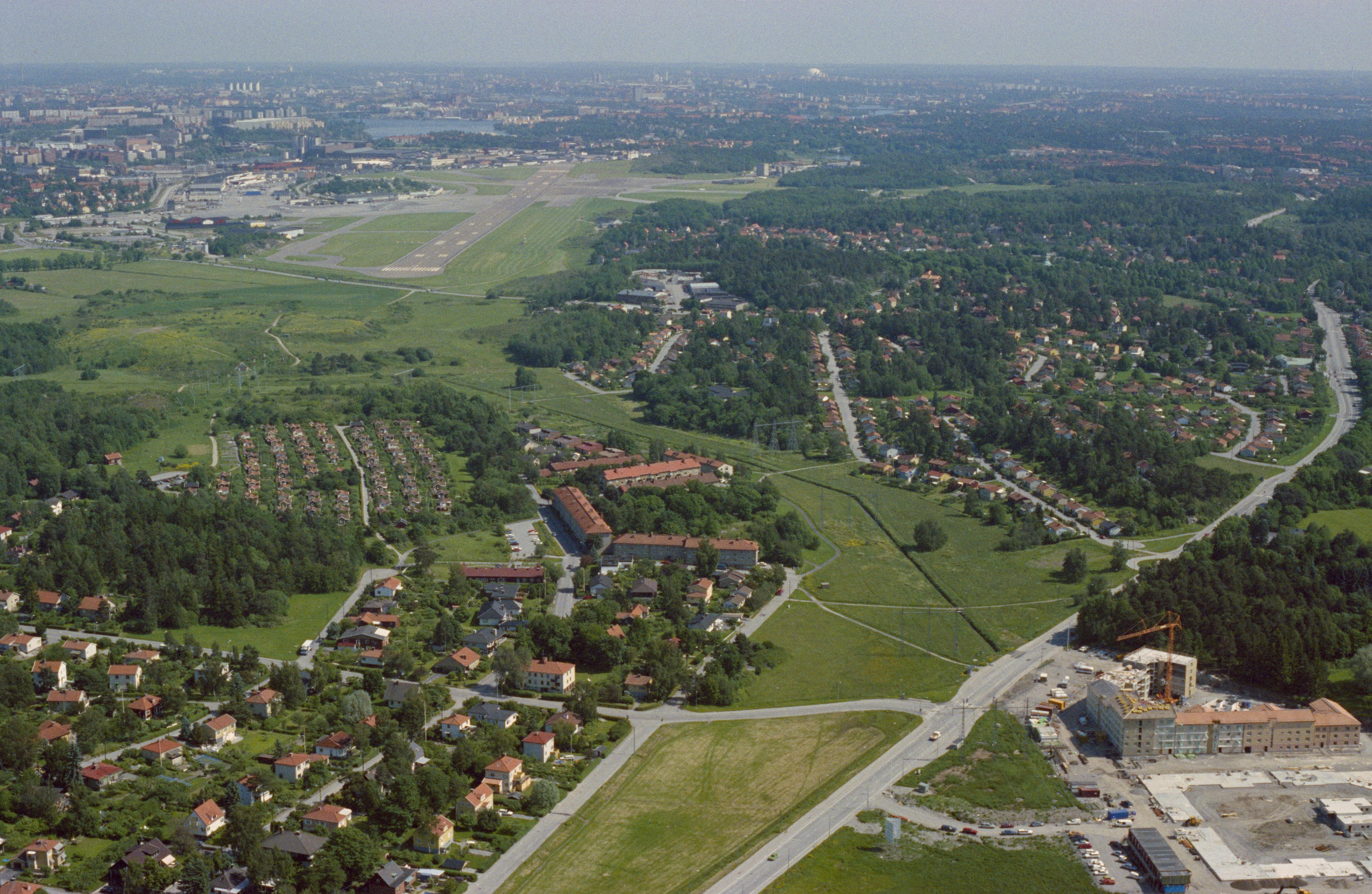 Beskrivning: Områdena Flysta, Sundby och Beckomberga. Till vänster om bildens mitt koloniträdgård vid Sundby. I bildens övre del Bromma flygplats mot Stockholms stad. Bilden är tagen mot (väderstreck): Ö