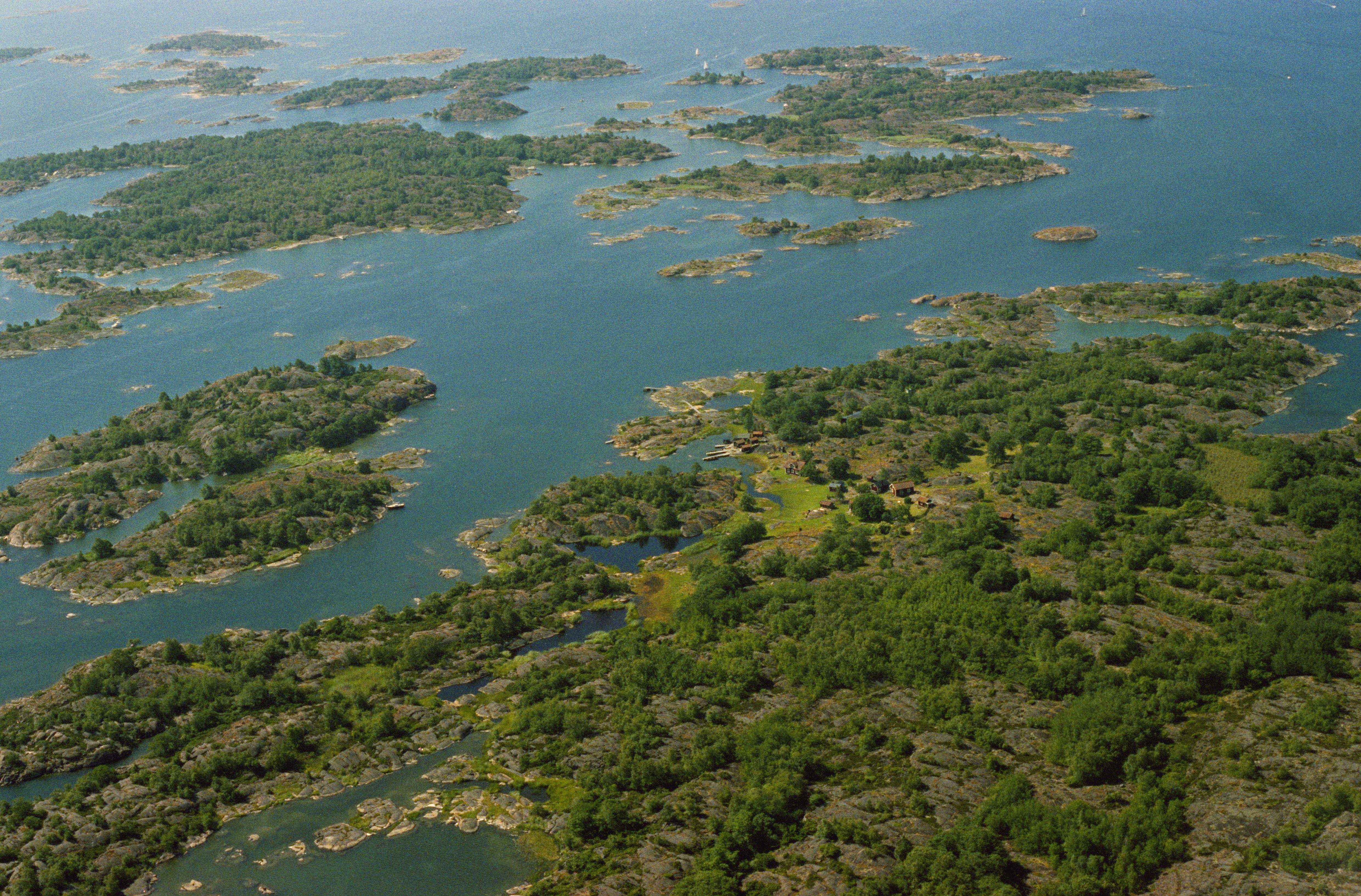 Beskrivning: Långviksskärs naturreservat i Nämndöfjärden. Ön Långviksskär med kringliggande öar och holmar. Under bildens mitt Långviksskärs by med husgrund RAÄnr Nämdö 24:1 vid Björkströmmen. Bilden är tagen mot (väderstreck): SV