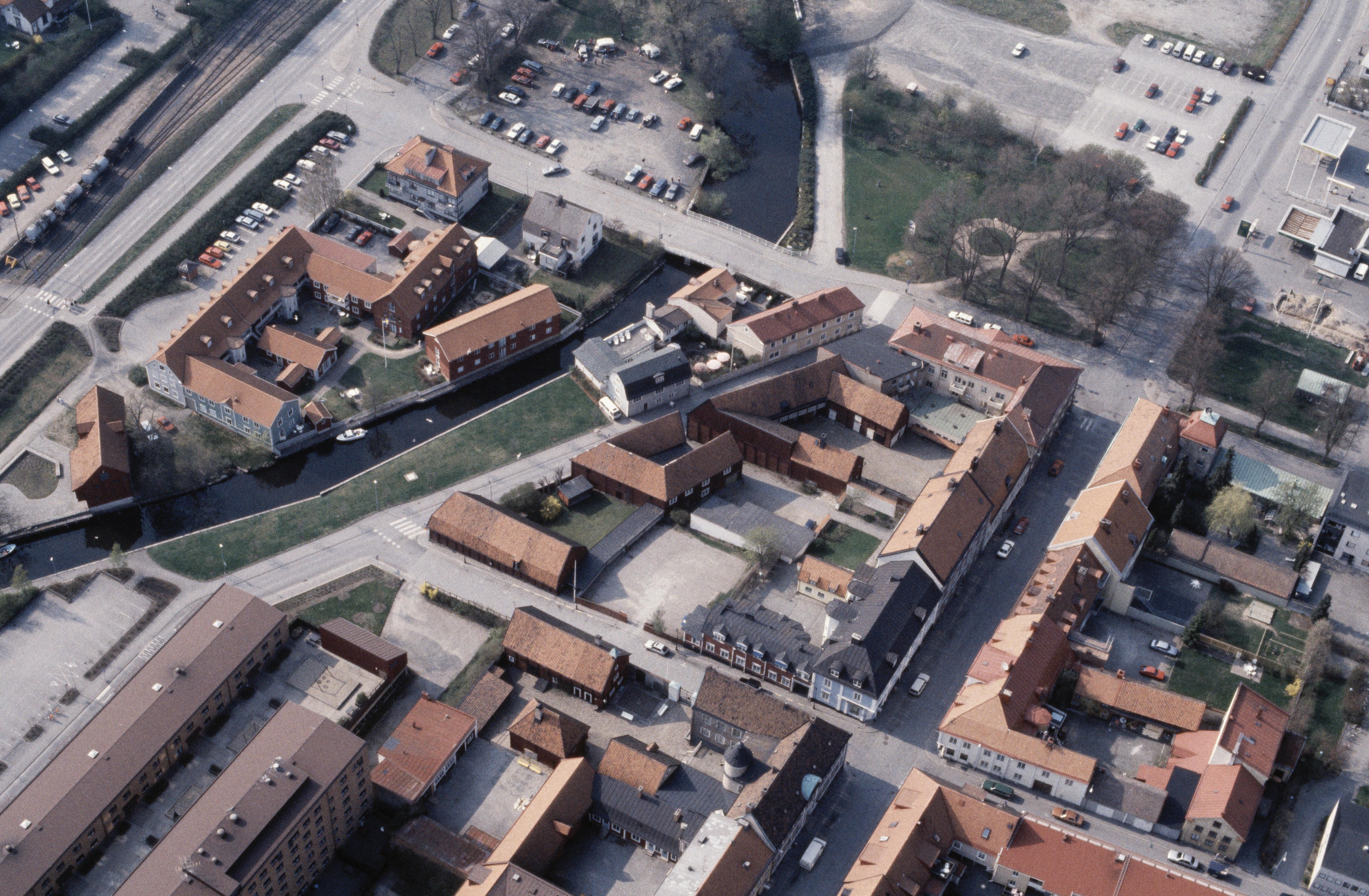 Beskrivning: Karlshamns stad. Vid bildens mitt byggnadsminnet Borgargården / Skottbergska gården RAÄnr Karlshamn 15:1. Bilden är tagen mot (väderstreck): NV