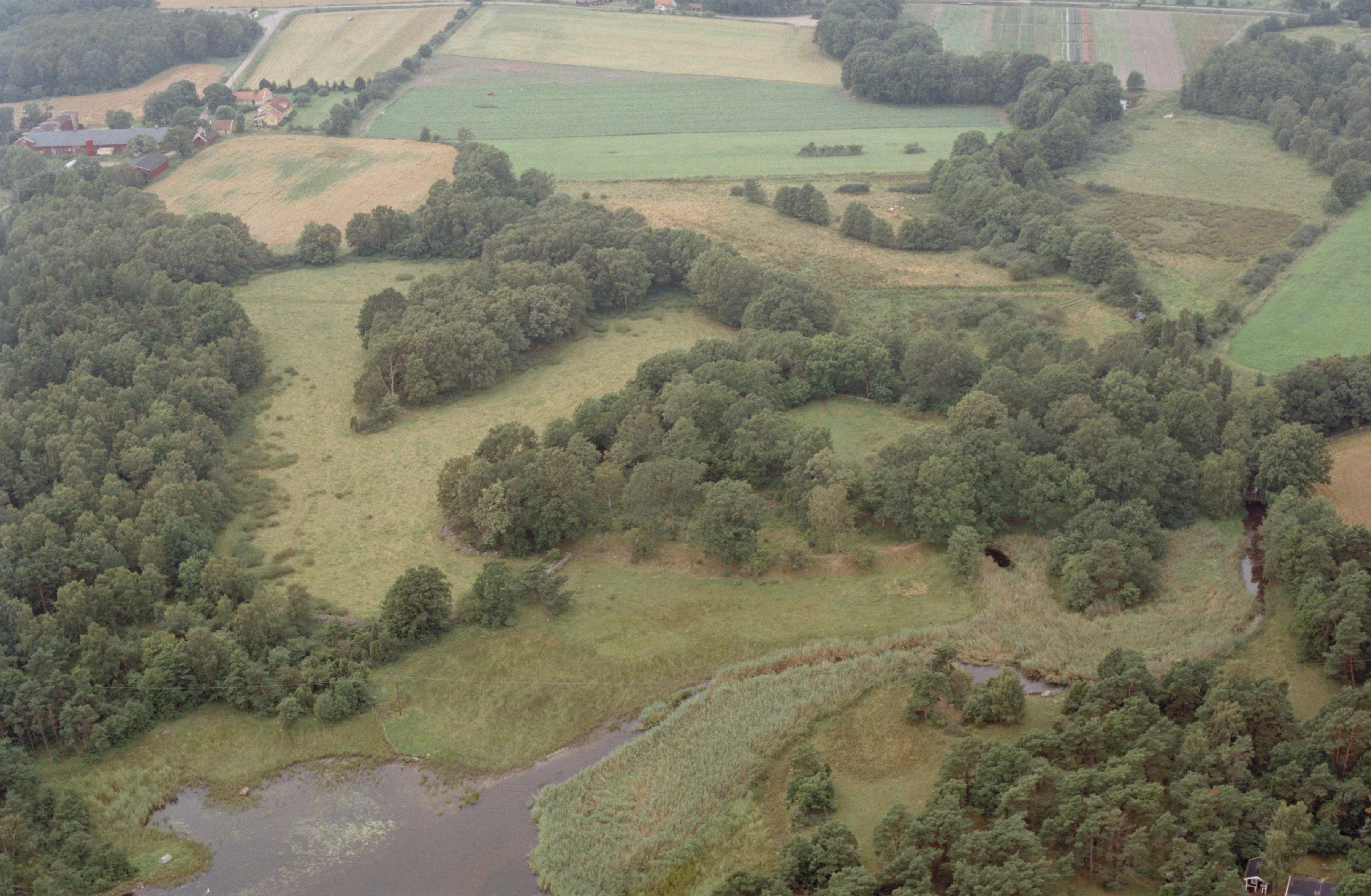 Beskrivning: Ån Brömsebäck markerar gränsen Kristianopel/Söderåkra s:nr och gränsen Småland/Blekinge. Borg Brömsehus RAÄnr Kristianopel 1:1. Helt nederst till höger Bröms i Söderåkra sn Riksintresset "H39 - Bröms?. Bilden är tagen mot (väderstreck): SV