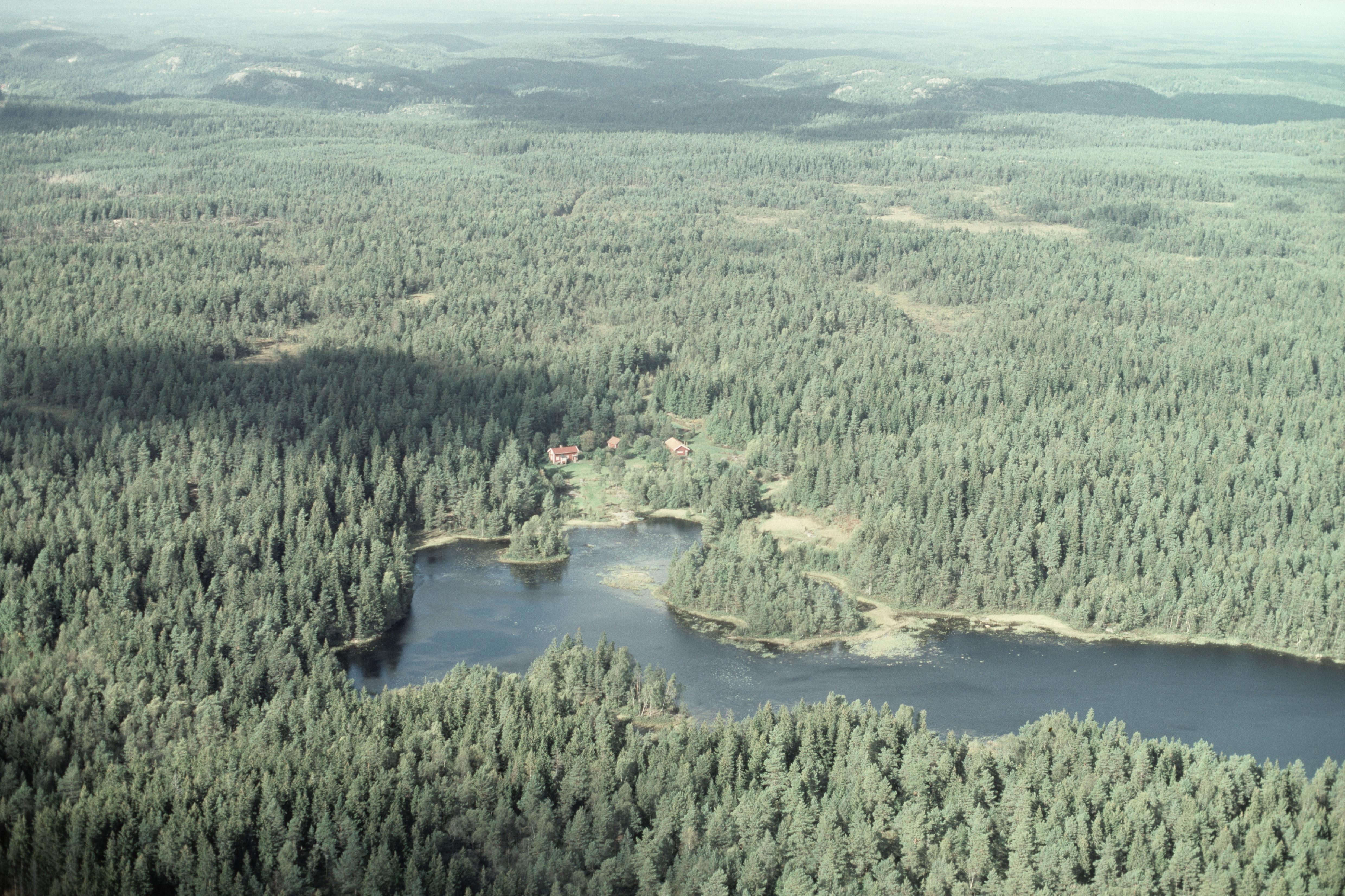 Beskrivning: Lilla Holmevattnet vid gränsen mellan socknen Grinneröd och Ljung (i bildens högra del). Vid bildens mitt torpet Holmen. Bilden är tagen mot (väderstreck): NV