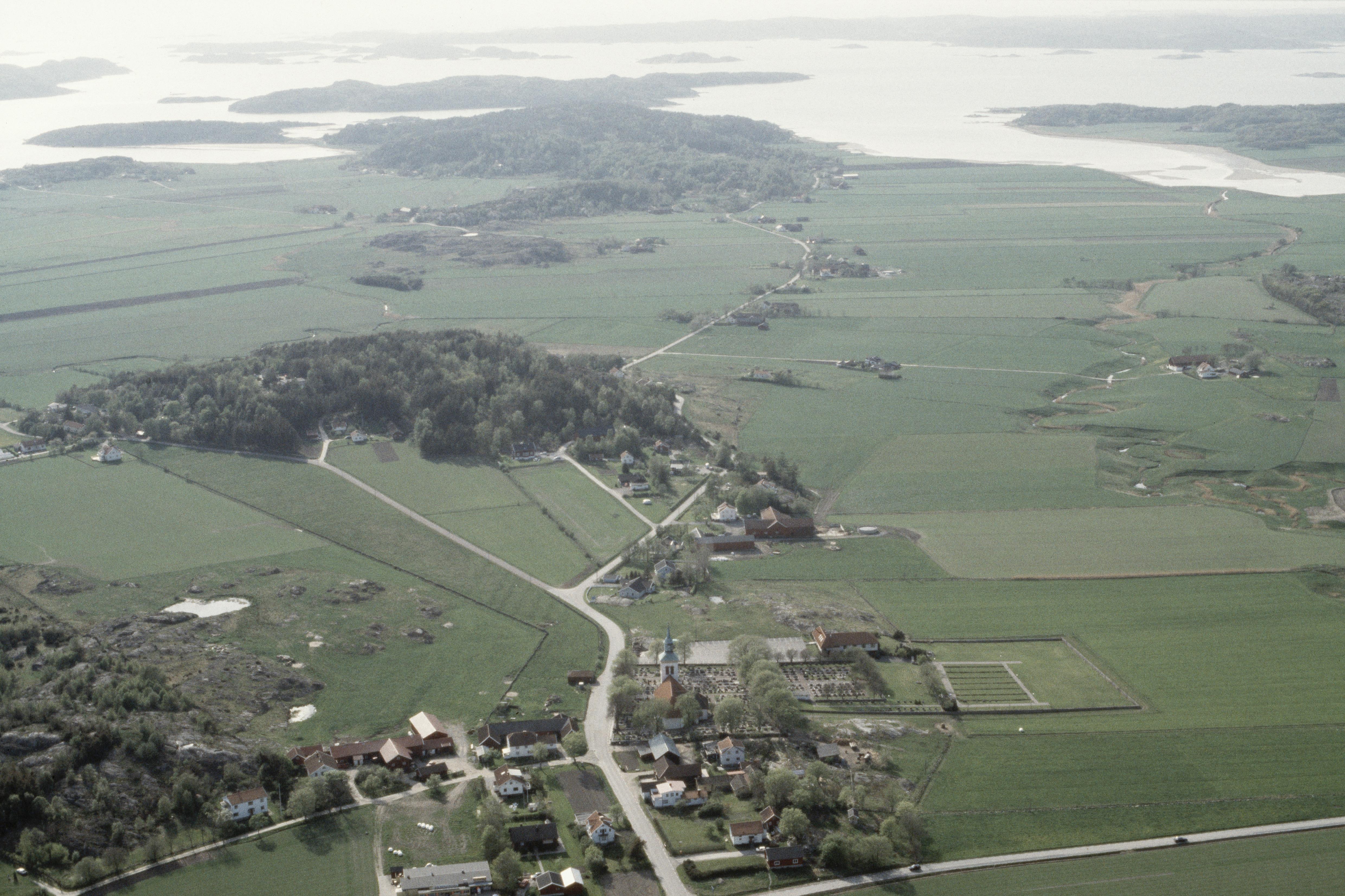 Beskrivning: Solberga kyrka och kyrkby i Vallbyåns dalgång. I bildens övre del Vallby och vikarna Ödsmål kile och Vallby kile. Bilden är tagen mot (väderstreck): VNV