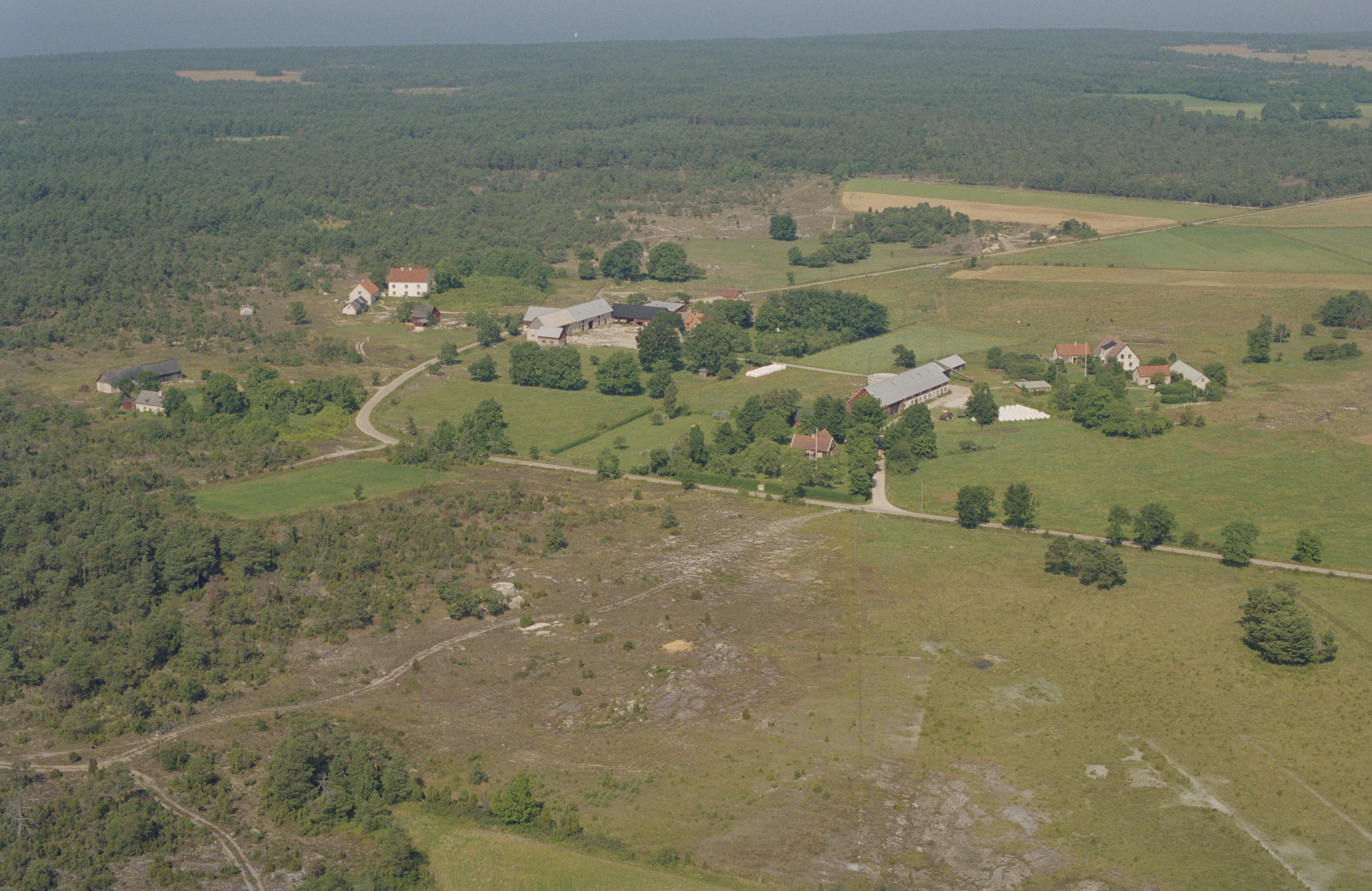 Beskrivning: Häftings by med gårdarna Stora Häftings (vid bildens mitt) och Lilla Häftings (uppe till vänster). Lämningar efter kalkugn RAÄnr Hangvar 216:1 under bildens mitt. Bilden är tagen mot (väderstreck): N