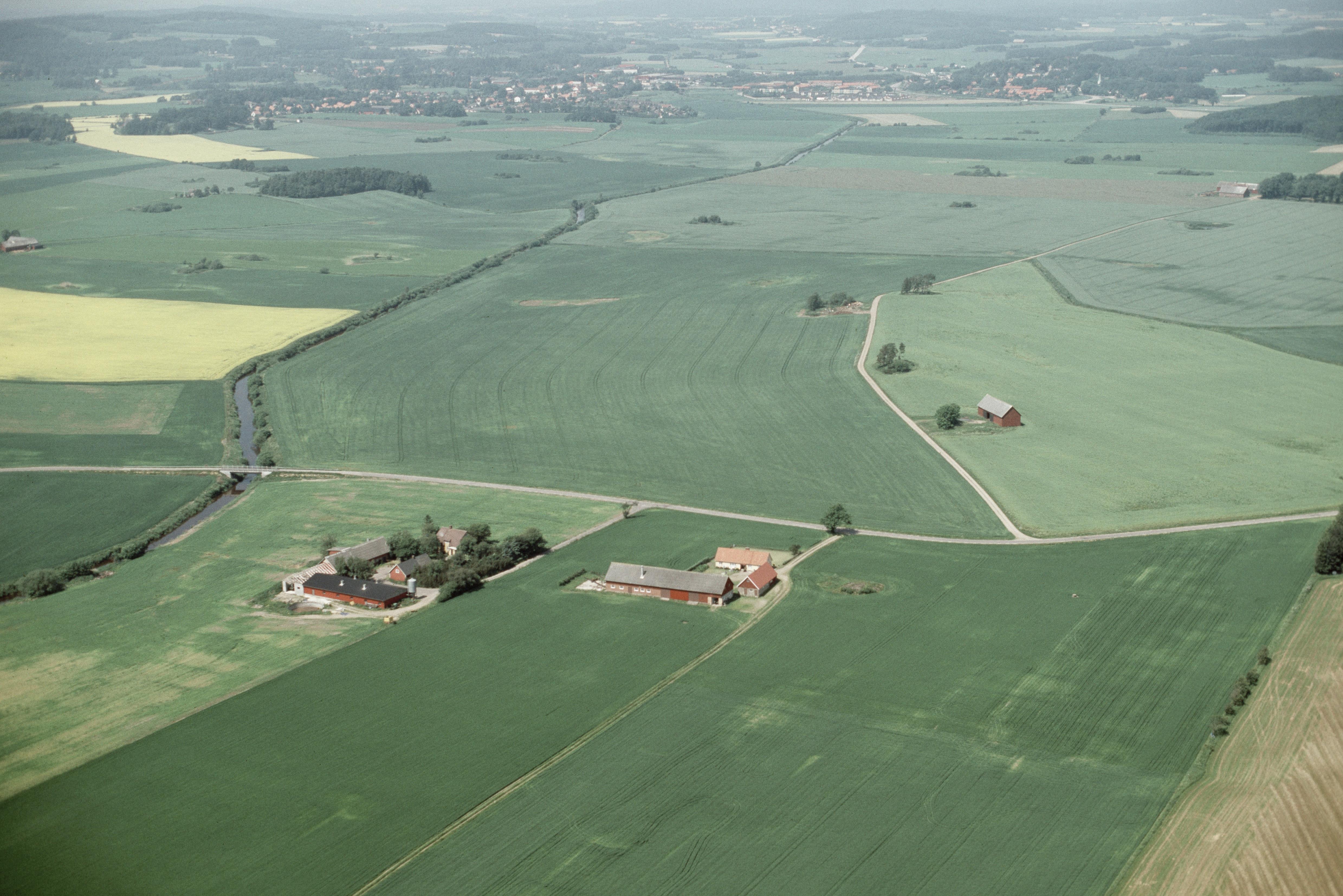Beskrivning: Innan bygge av väg E6 mellan Laholm och Slöinge. Suseån vid Folkastad, Bonnasgård och Källinge. I bildens övre del Getinge socken. Bilden är tagen mot (väderstreck): NNV