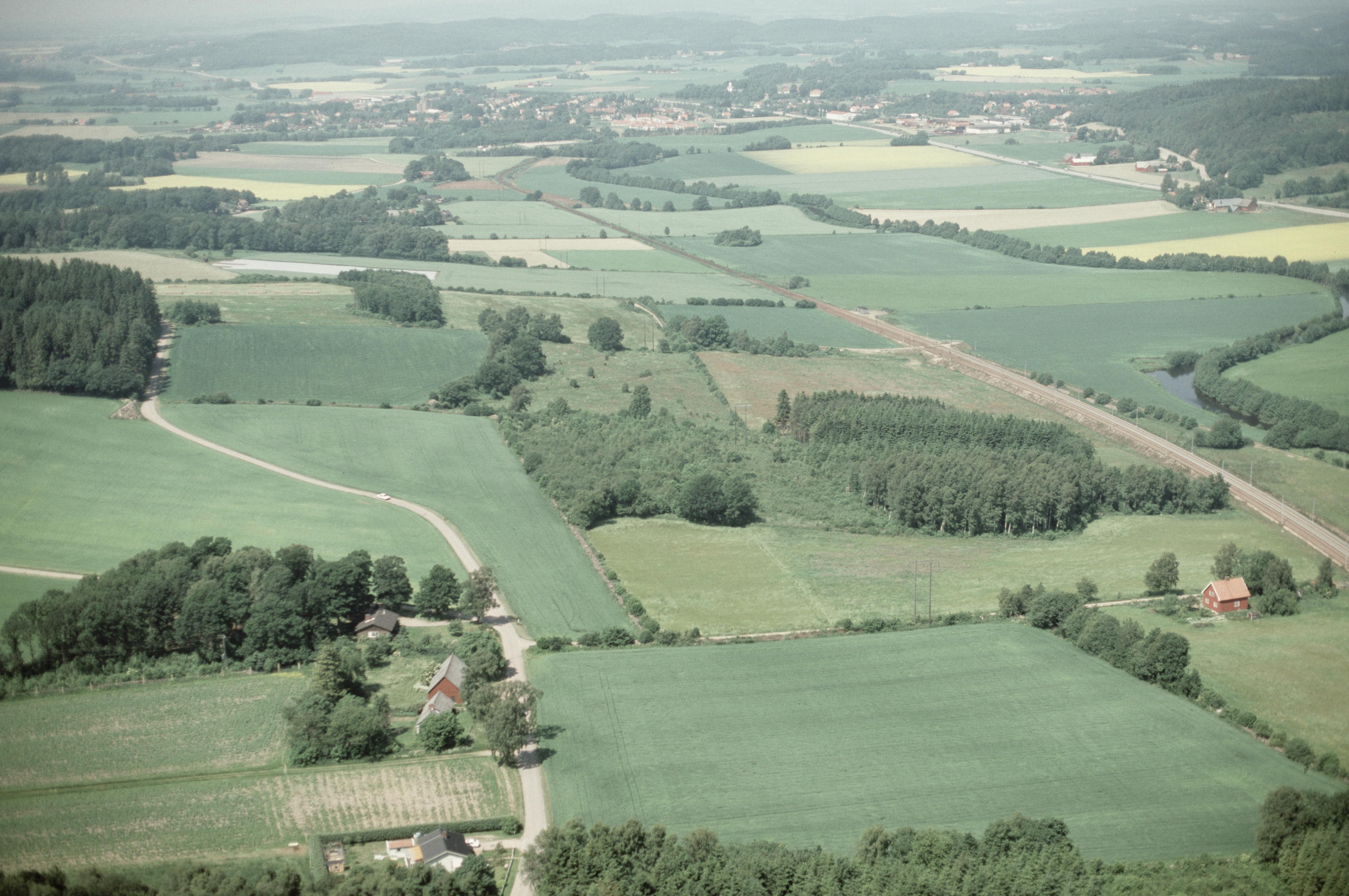 Beskrivning: Suseåns dalgång söder om tätorten och kyrkbyn Stenstorp. I bildens nedre del fossil åker RAÄnr Slöinge 119:1. Boplats RAÄnr Slöinge 79:1 vid bildens mitt. I bildens övre del Slöinge kyrka och tätort. Bilden är tagen mot (väderstreck): NNV