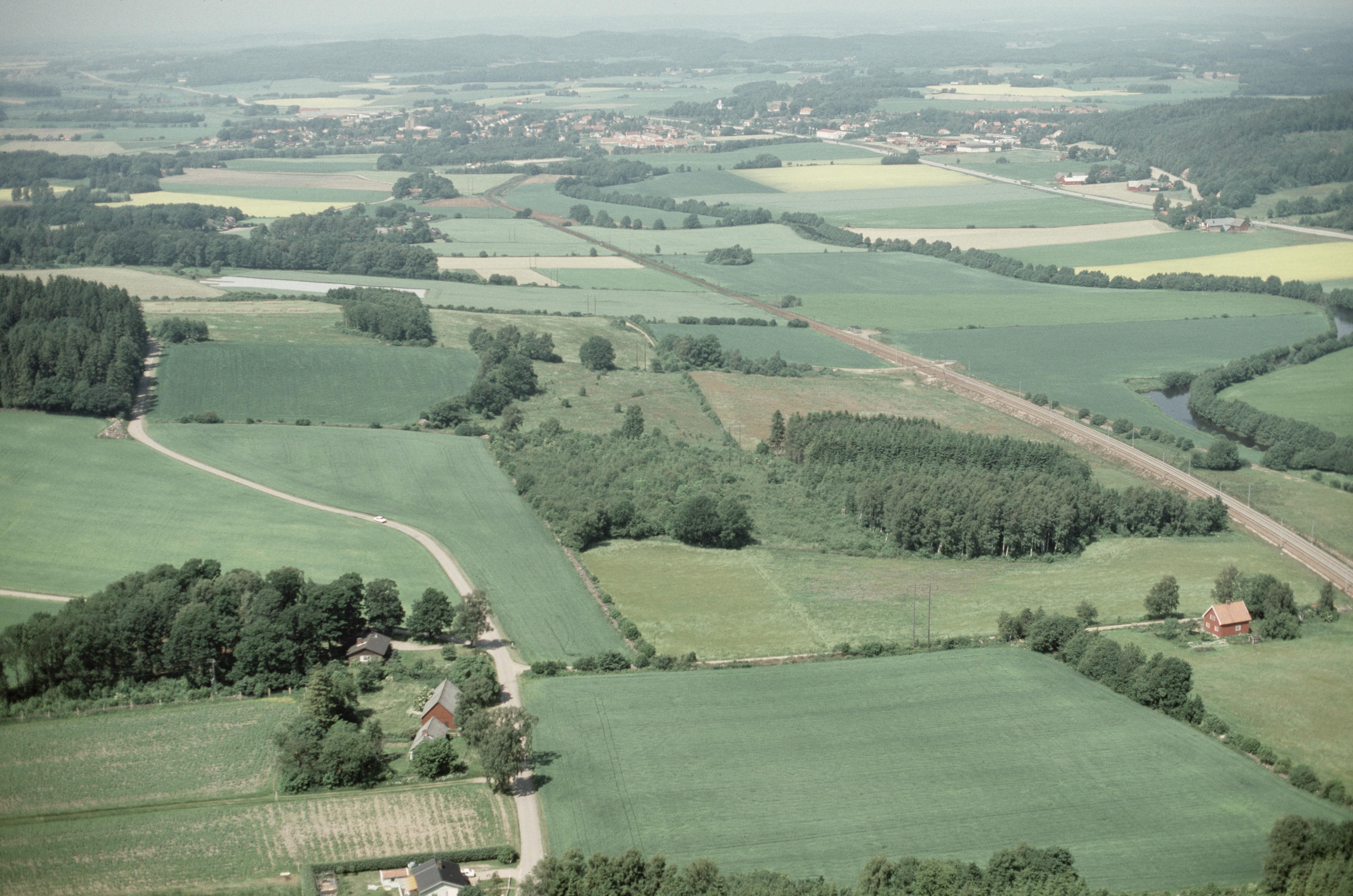 Beskrivning: Suseåns dalgång söder om tätorten och kyrkbyn Stenstorp. I bildens nedre del fossil åker RAÄnr Slöinge 119:1. Boplats RAÄnr Slöinge 79:1 vid bildens mitt. I bildens övre del Slöinge kyrka och tätort. Bilden är tagen mot (väderstreck): NNV