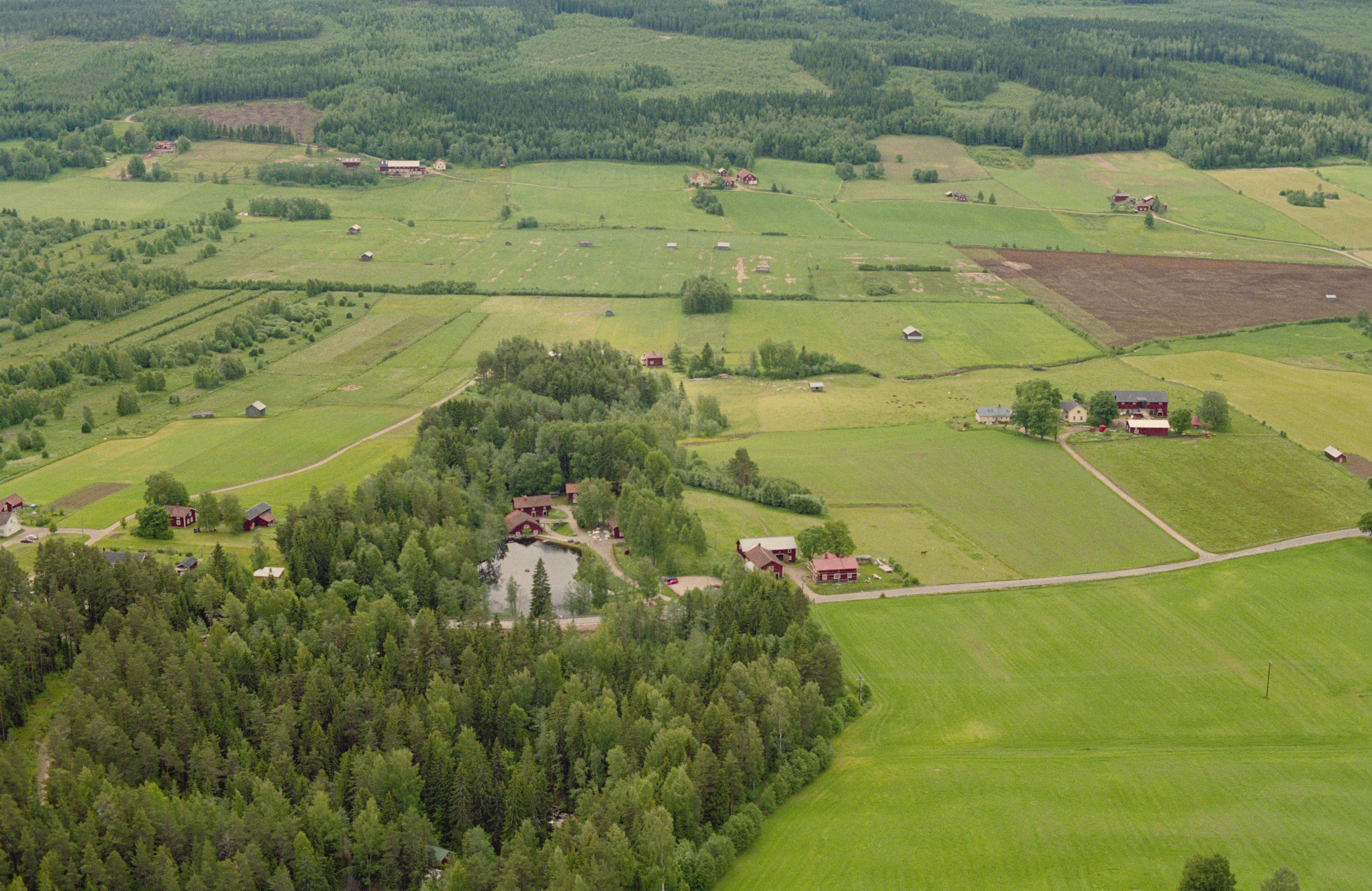 Beskrivning: Växbo by, östra delen vid Växbo kvarn och Sörom. Till vänster i bildens nedre kant södra änden av Trolldalen RAÄnr Bollnäs 417:1 i Vaxboåns dalgång. Till vänster under bildens mitt bro RAÄnr Bollnäs 489:1. Vaxbo kvarn. Bilden är tagen mot (väderstreck): S