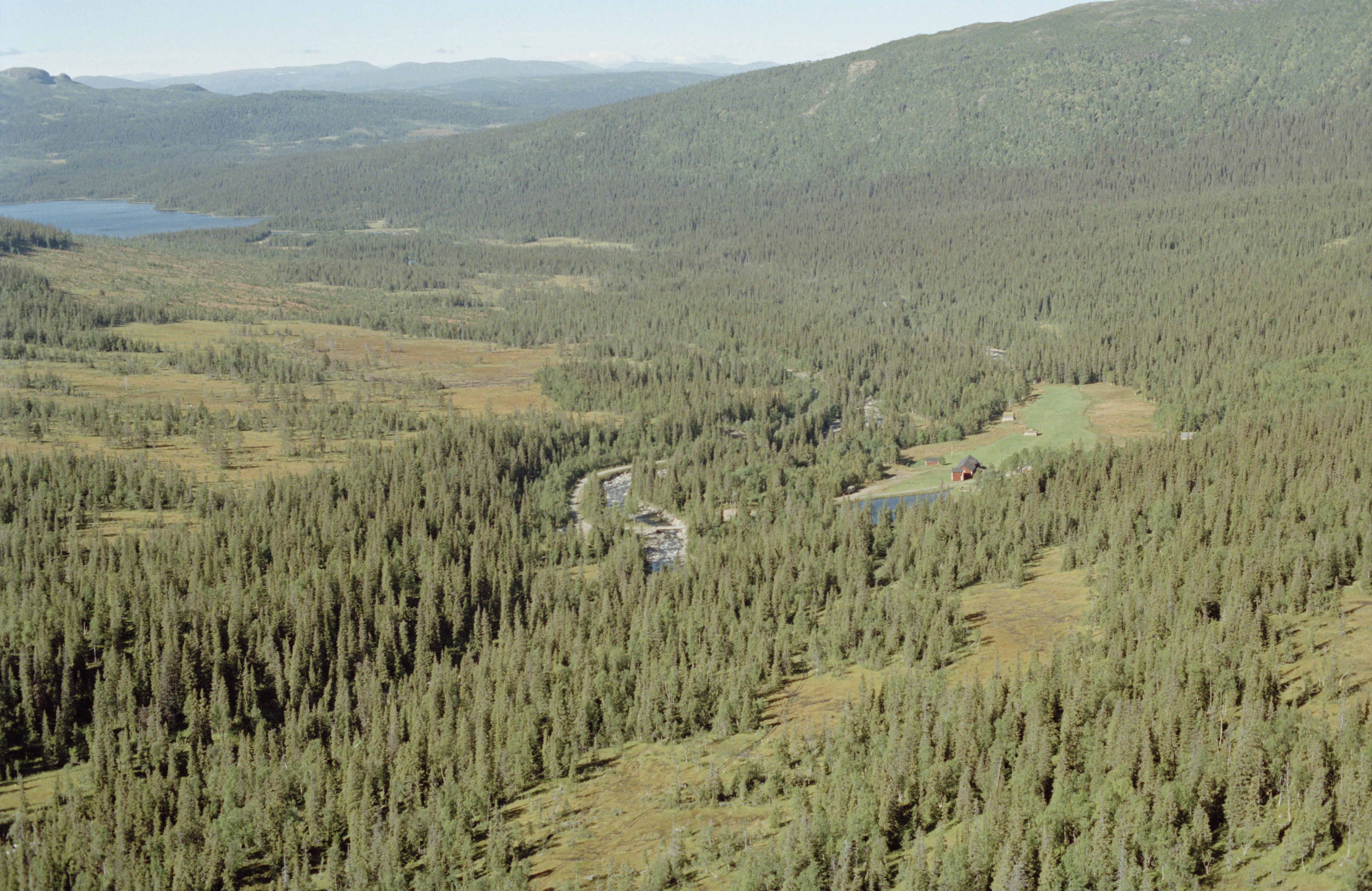 Beskrivning: Väktardalens naturreservat i Väktaråns dalgång. Vid bildens mitt ensamgården Väktarmon. Uppe till vänster sjön Lill-Väktaren. Bilden är tagen mot (väderstreck): NV