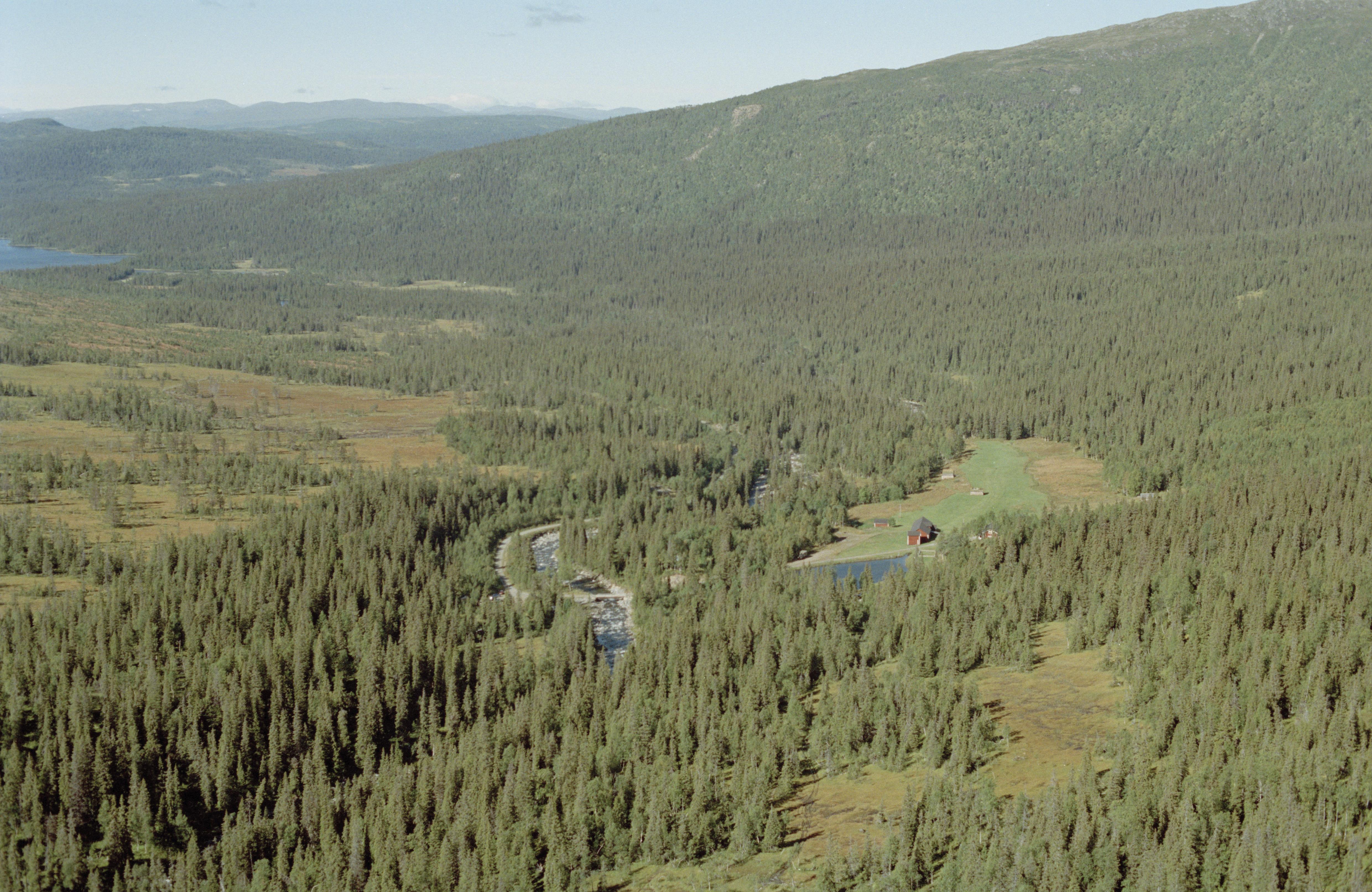 Beskrivning: Väktardalens naturreservat i Väktaråns dalgång. Vid bildens mitt ensamgården Väktarmon. Uppe till vänster sjön Lill-Väktaren. Bilden är tagen mot (väderstreck): NNV