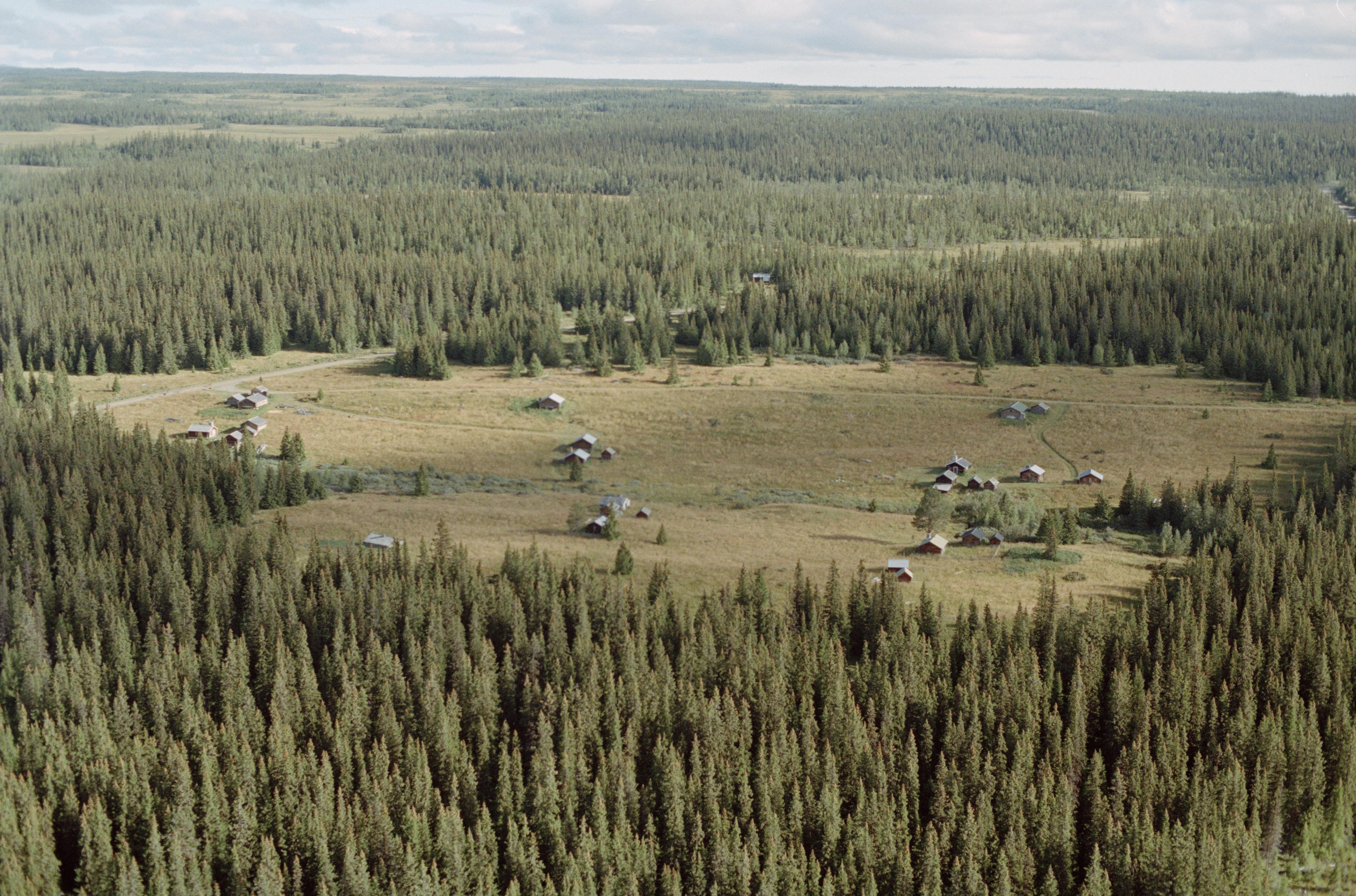 Beskrivning: Svedjebodarna i Ovikfjällens fäbodområde. Svedjebodbäcken rinner genom fäbodsbyn. Långbodåsen över bildens mitt. Bilden är tagen mot (väderstreck): NO