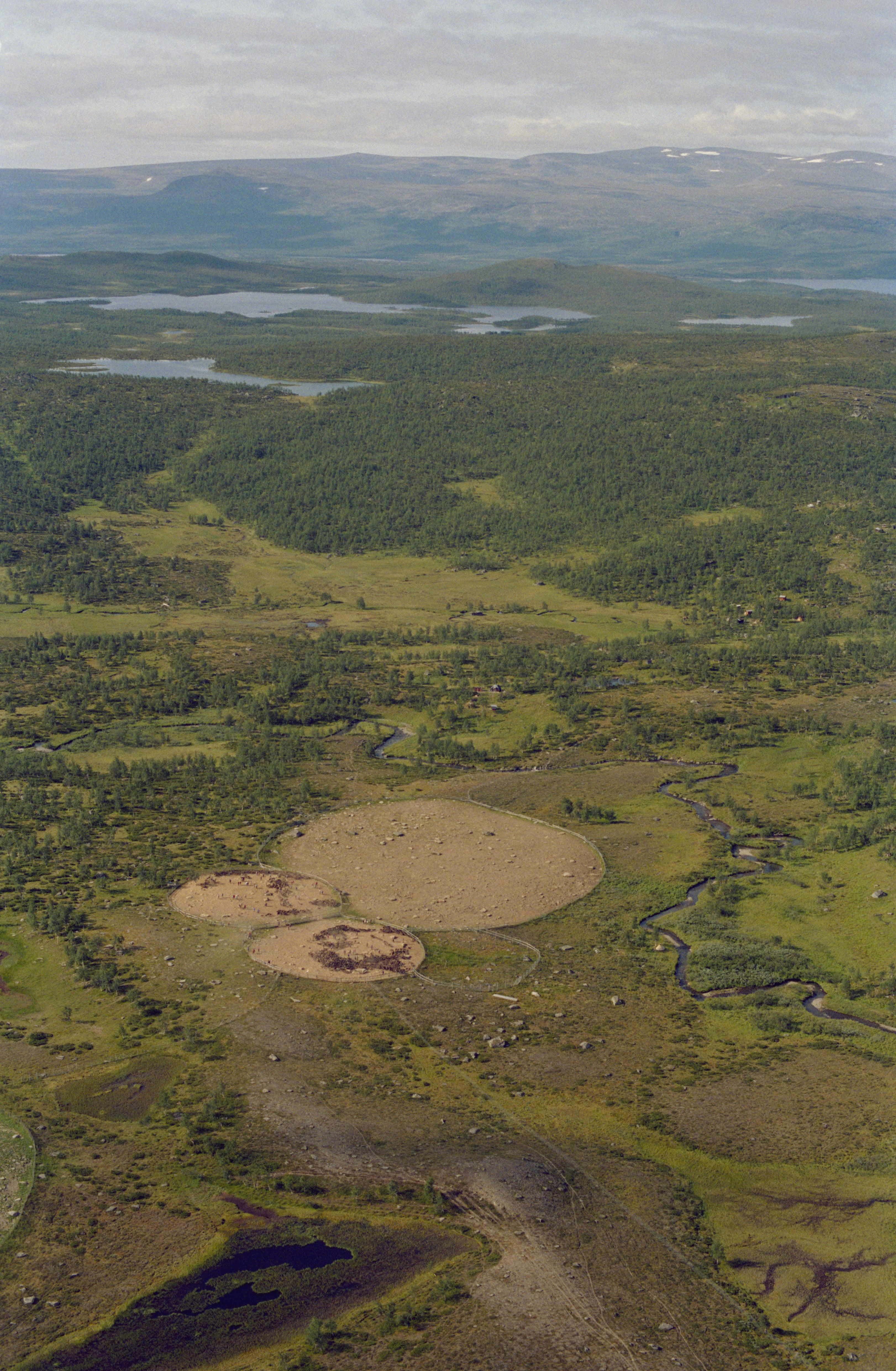 Beskrivning: Samevistet Parka (Bárkka). Till vänster över bildens mitt fångstgropssystem RAÄnr Arjeplog 327:1. Under bildens mitt rengärden med renskiljning (rarkning). Uppe till vänster sjöarna Jiervajávrátj och Sáddermjávrre. Bilden är tagen mot (väderstreck): SV