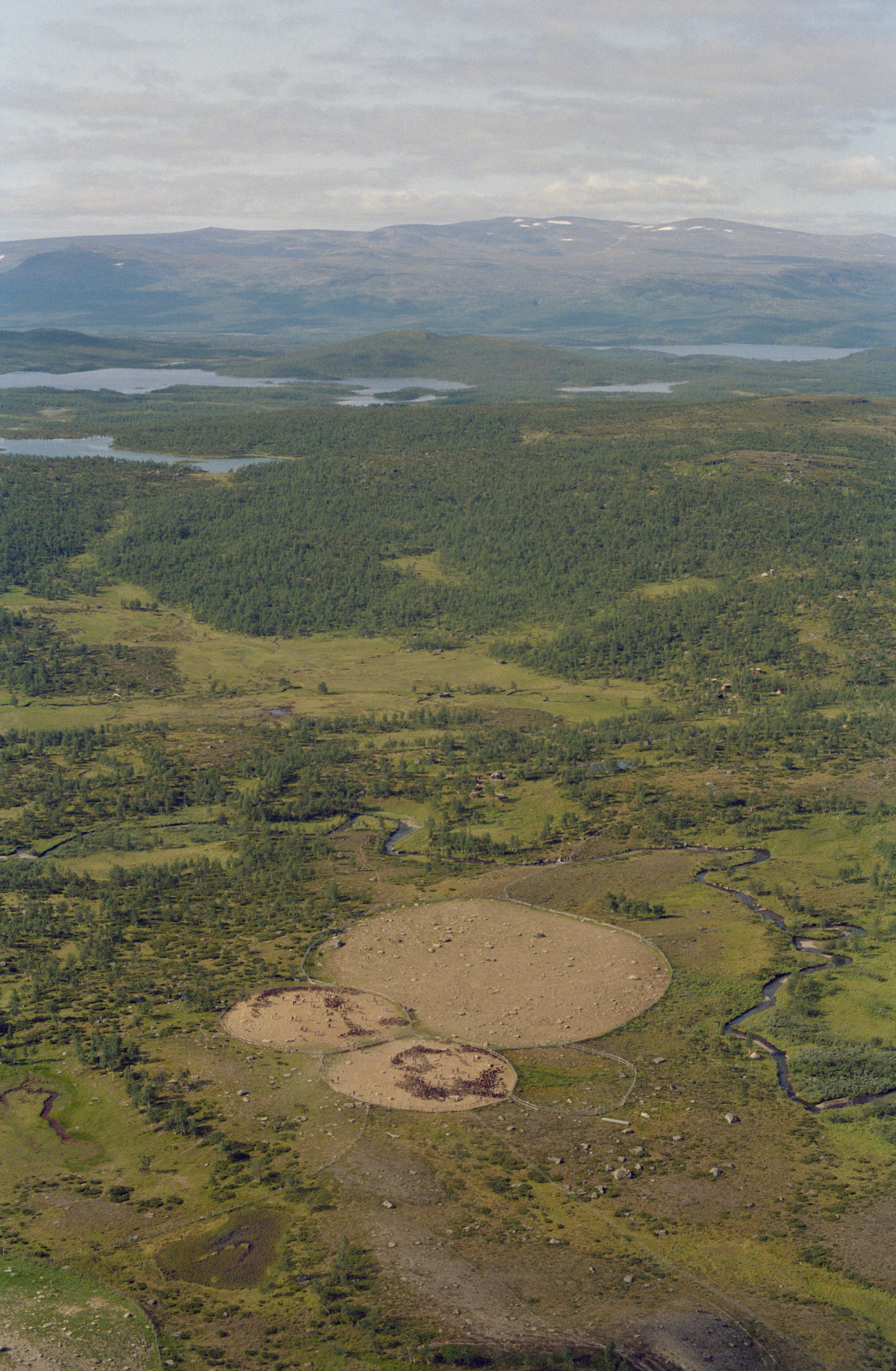 Beskrivning: Samevistet Parka (Bárkka). Till vänster över bildens mitt fångstgropssystem RAÄnr Arjeplog 327:1. Under bildens mitt rengärden med renskiljning (rarkning). Uppe till vänster sjöarna Jiervajávrátj och Sáddermjávrre. Bilden är tagen mot (väderstreck): SV