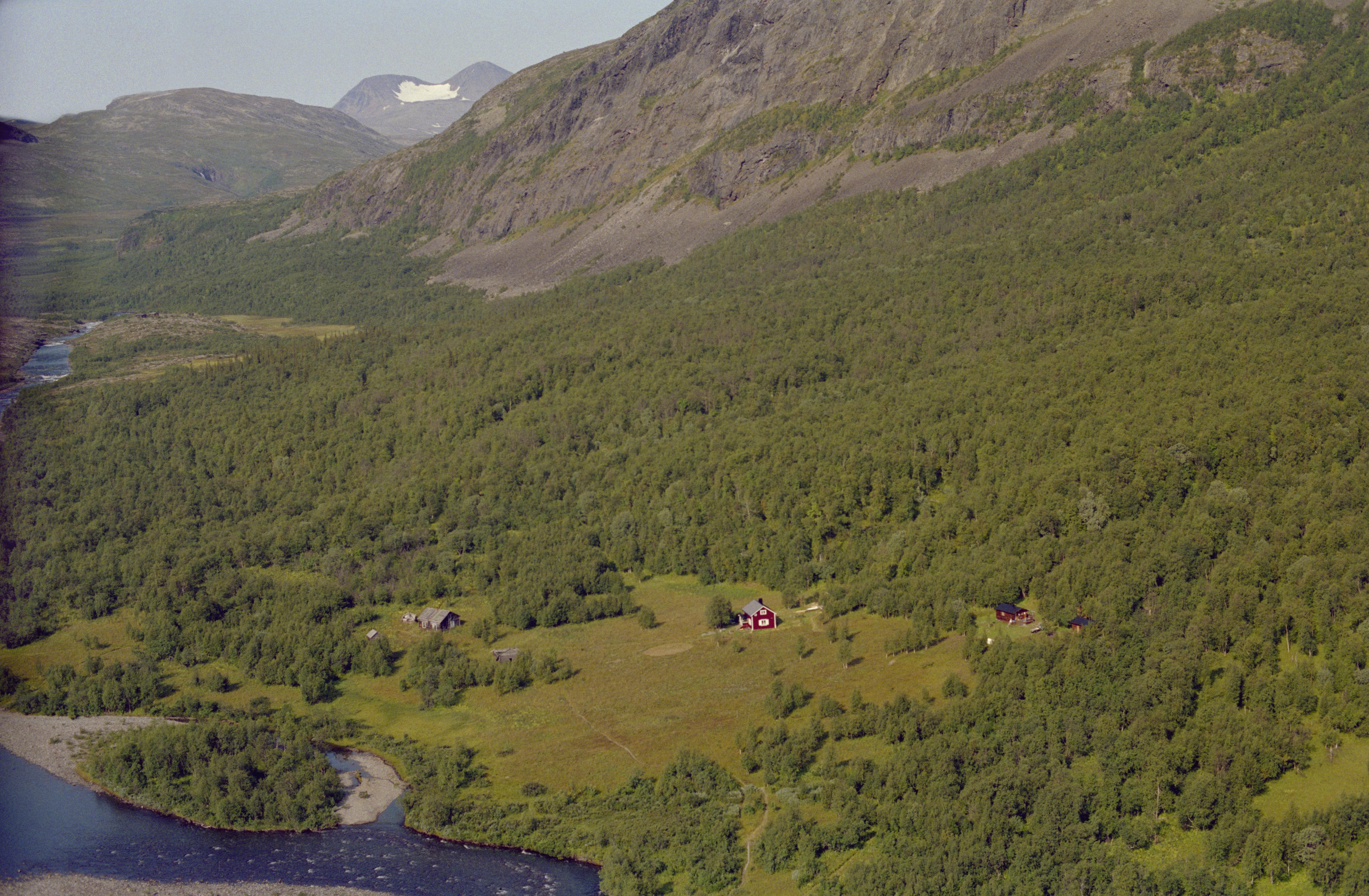 Beskrivning: Njunjesstugan vid Tarraälven (Tarraätno / Darreädno). I byn fyndplats RAÄnr Jokkmokk 2422:1 och skåre/jaktvärn Jokkmokk 2499:1 och 2500:1. Bilden är tagen mot (väderstreck): VNV