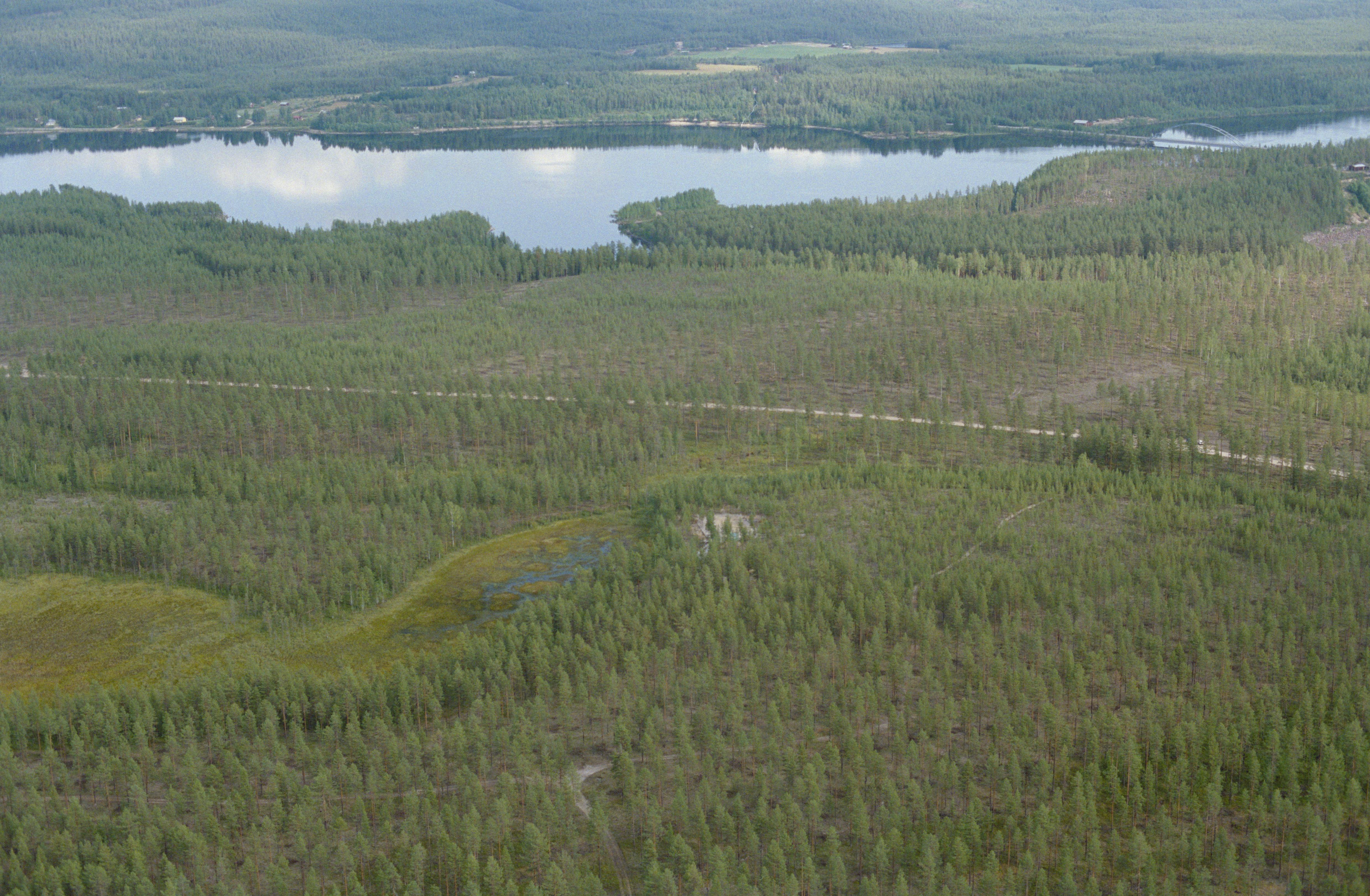 Beskrivning: Till vänster under bildens mitt Vuollerimboplatsen, en stenåldersboplats med hyddbotnar och fångstgrop RAÄnr Jokkmokk 1292:1-2 norr om tätorten Vuollerim (Vuolleriebme). Vid boplatsen härd RAÄnr Jokkmokk 4935 och 4936. Stora Luleälven (Stuor Julevädno) i bildens övre del. Bilden är tagen mot (väderstreck): Ö