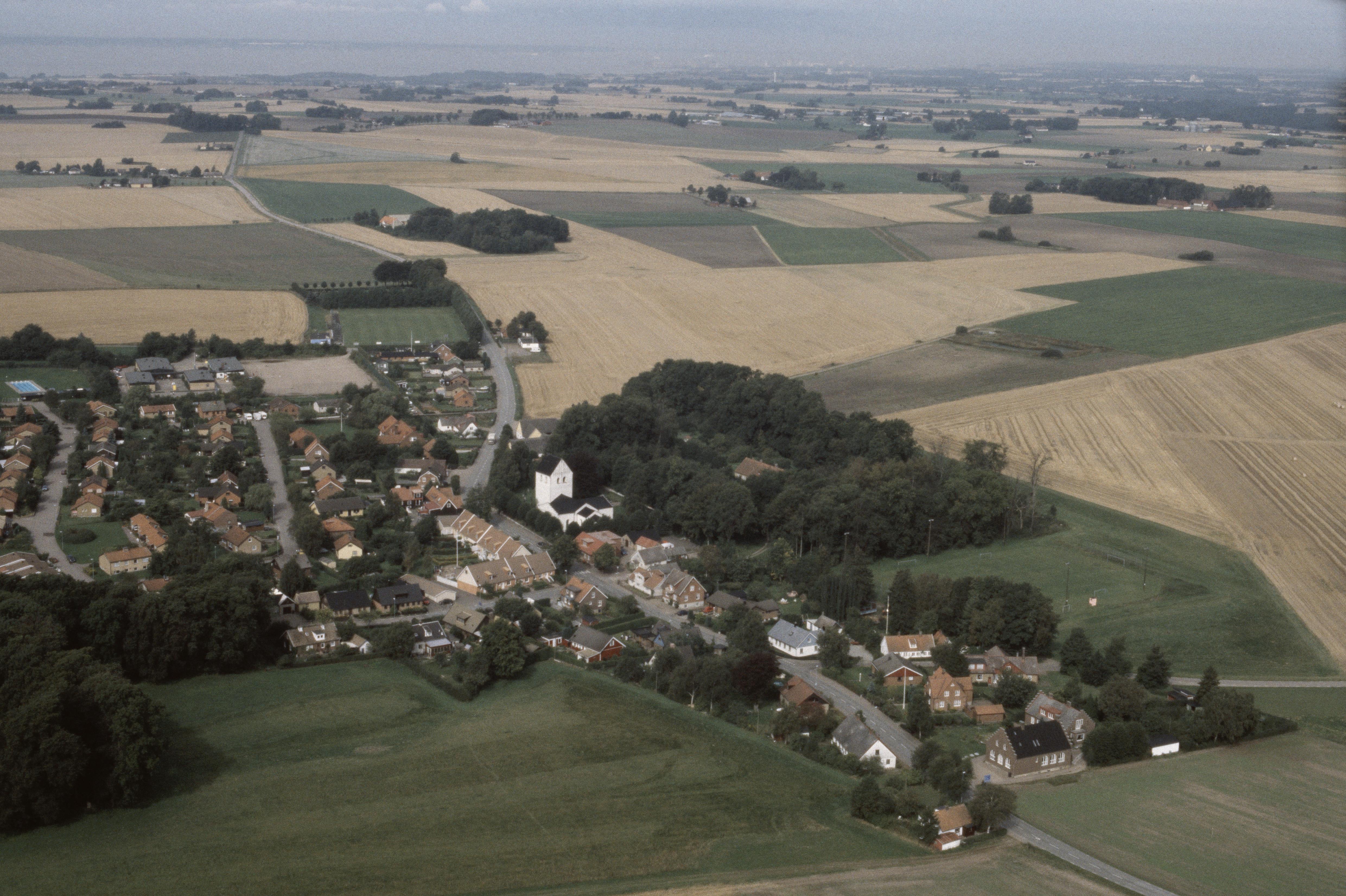 Beskrivning: Härslövs kyrka och kyrkby. Bilden är tagen mot (väderstreck): NV