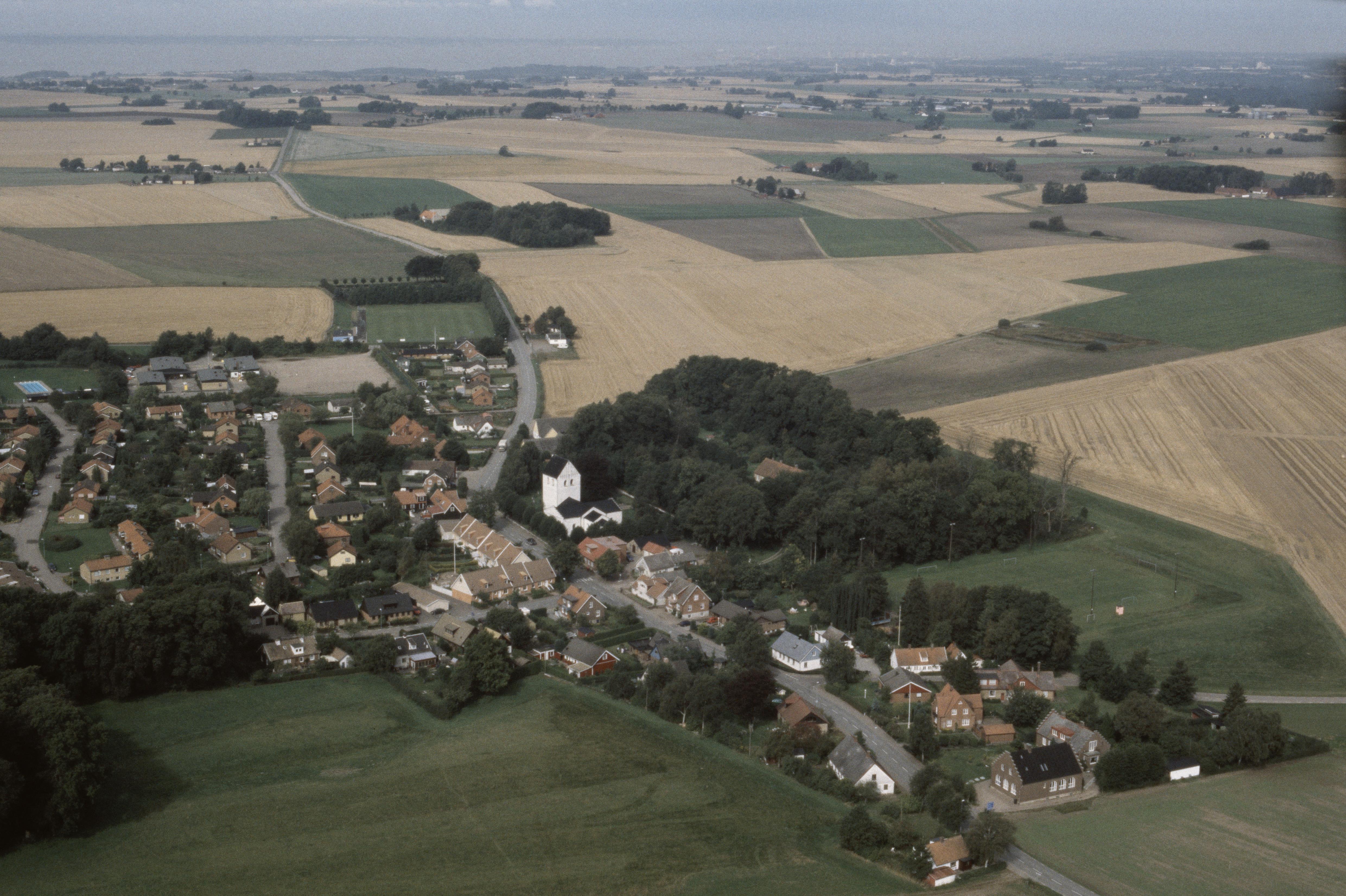 Beskrivning: Härslövs kyrka och kyrkby. Bilden är tagen mot (väderstreck): NV