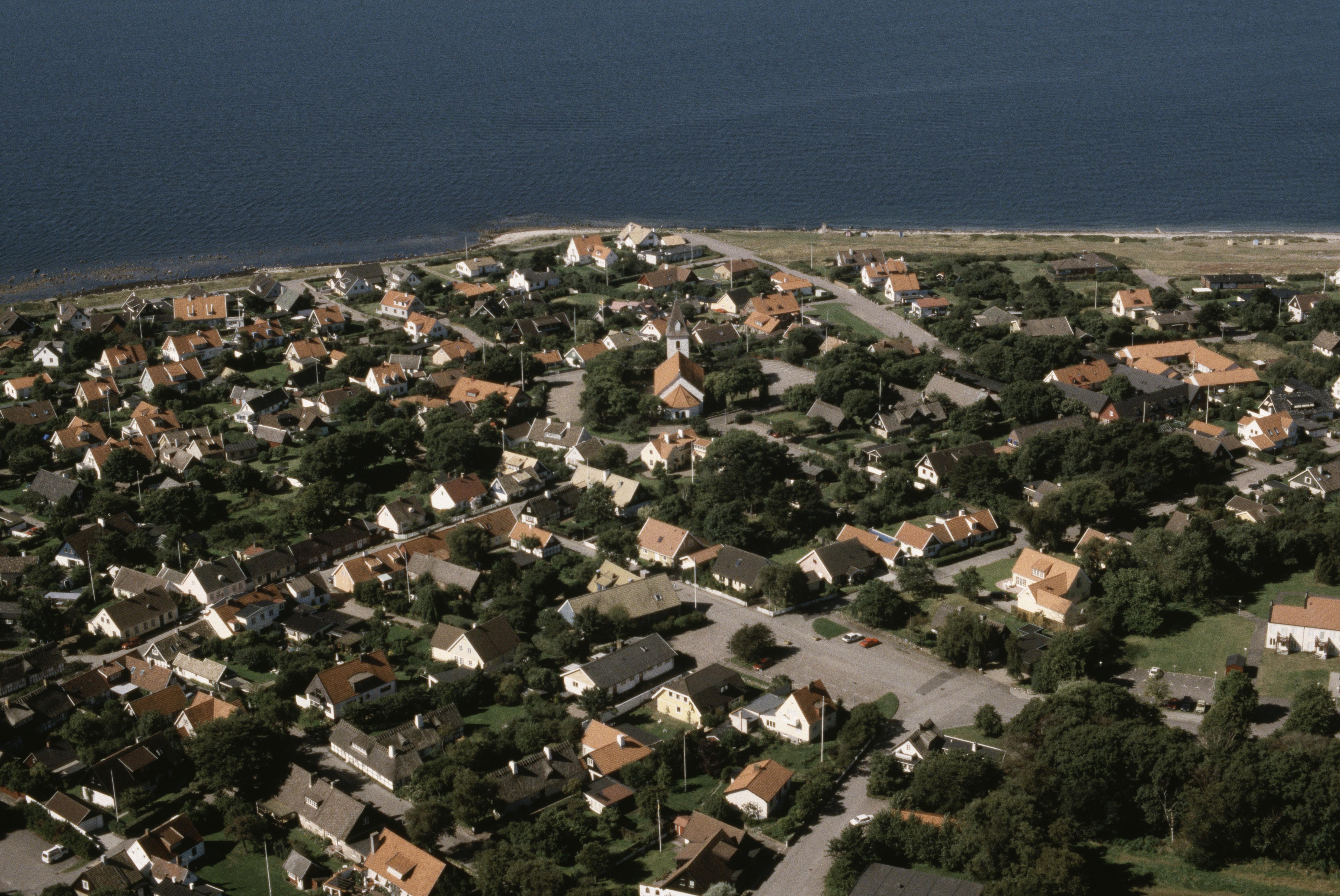 Beskrivning: Gamla Viken fiskehamn. Vikens kyrka vid bildens mitt. Bilden är tagen mot (väderstreck): V