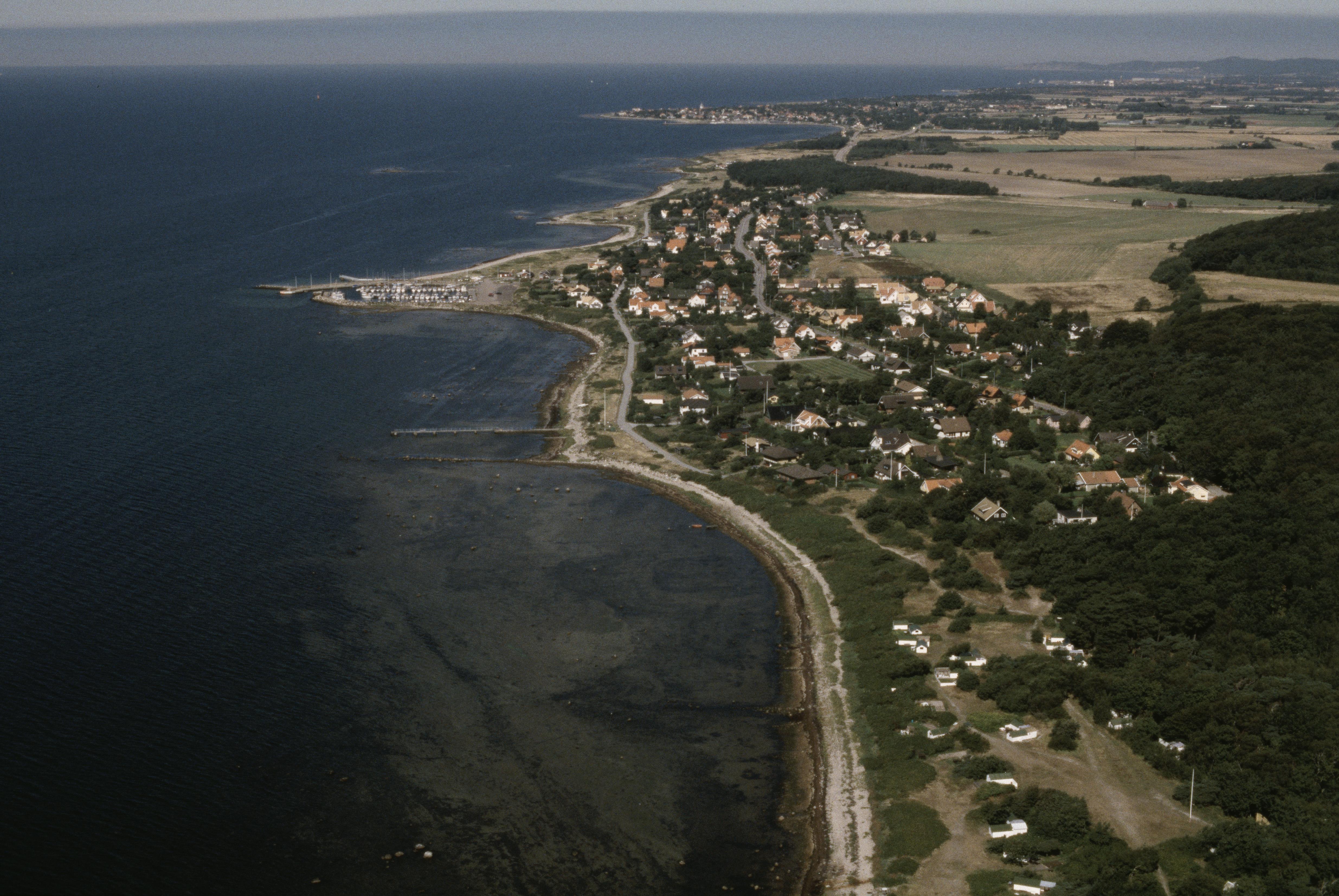 Beskrivning: Domstens fiskeläge i bildens övre del. I bildens nedre del norra delen av Kulla Gunnarstorp. Till höger om bildens mitt boplats RAÄnr Allerum 132:1 m.fl. Bilden är tagen mot (väderstreck): NO