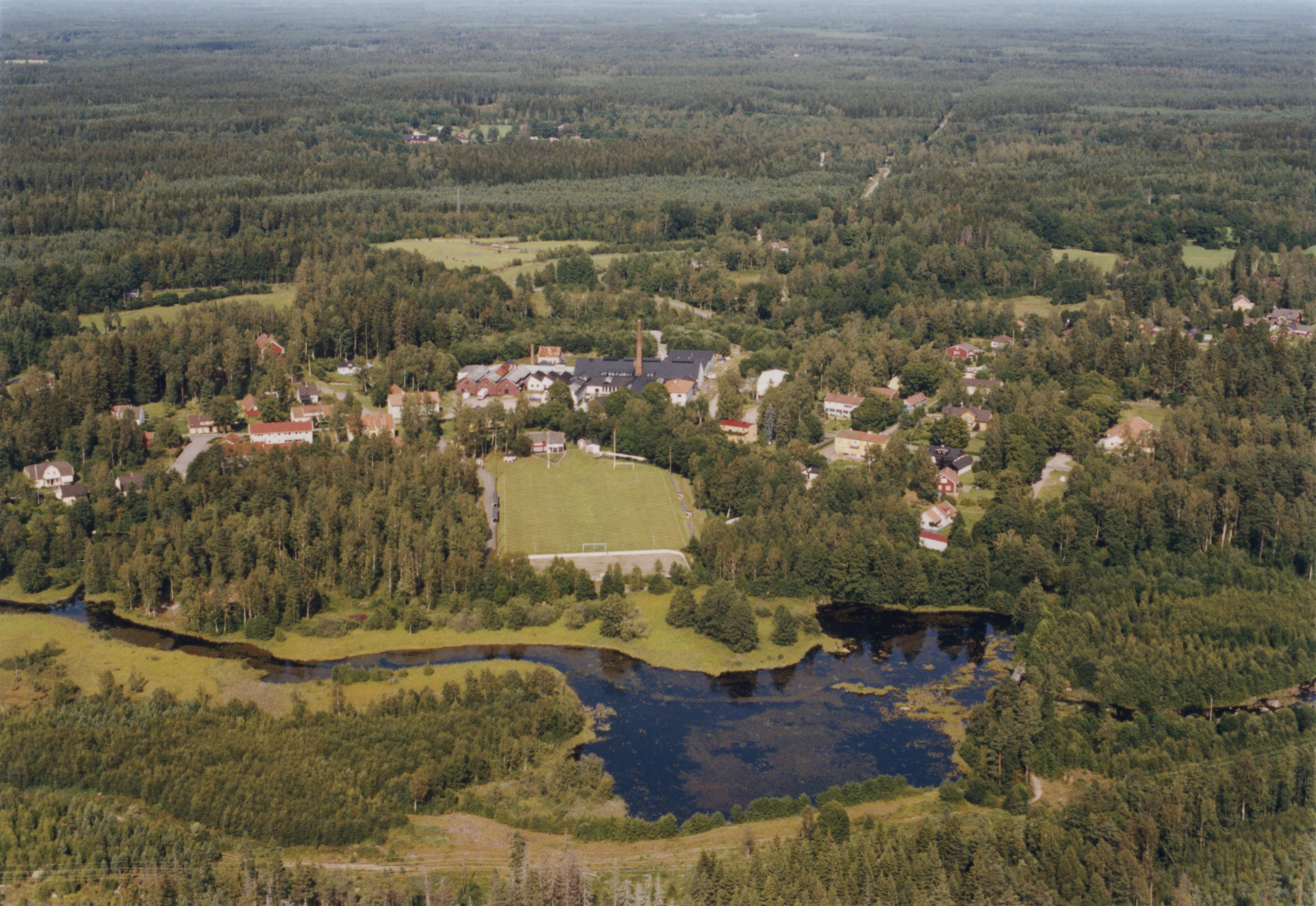 Beskrivning: Flygsfors bruk / Flygsfors glasbruk vid Ljungbyån. Bilden är tagen mot (väderstreck): NNO