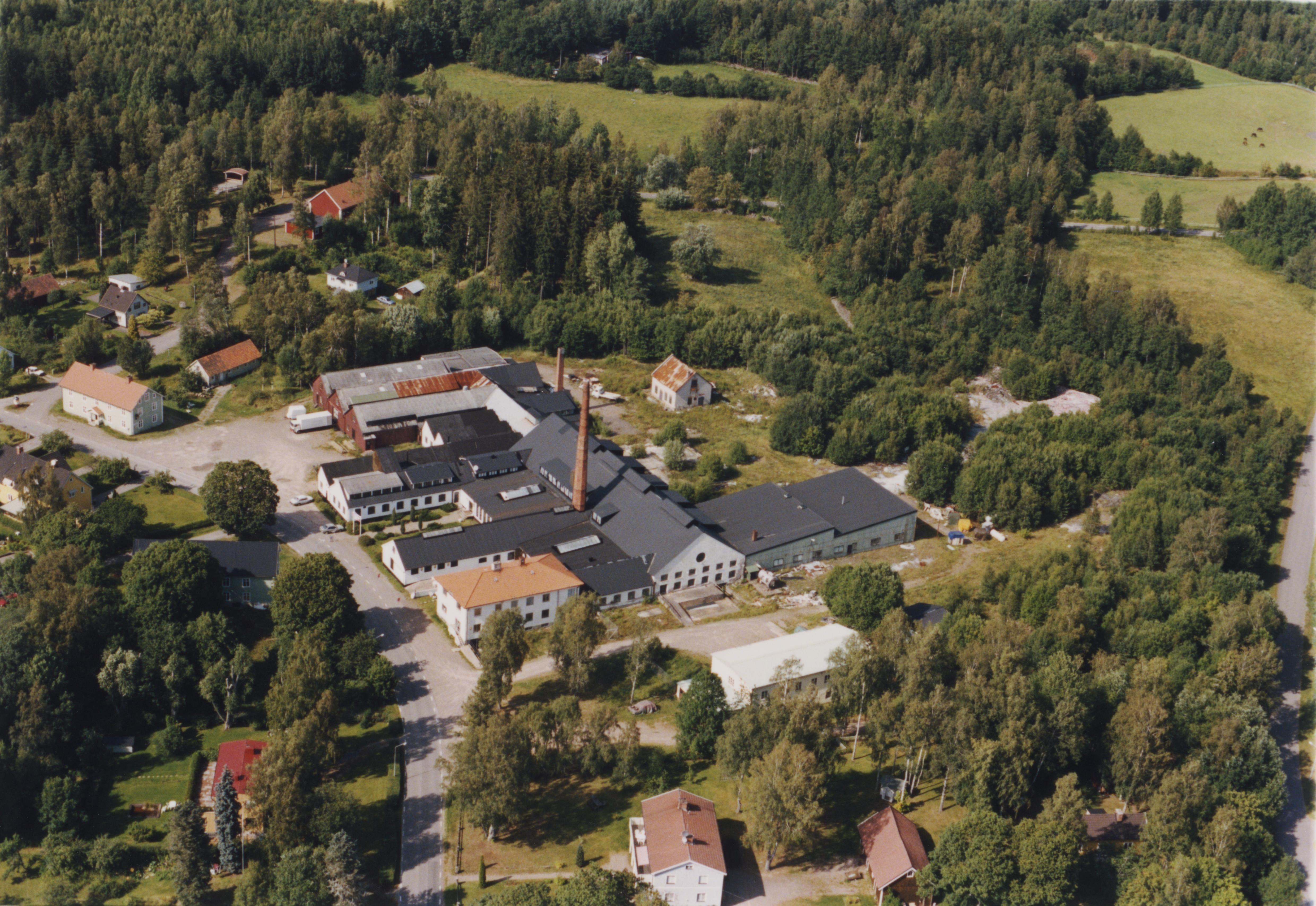 Beskrivning: Flygsfors bruk / Flygsfors glasbruk vid Ljungbyån. Bilden är tagen mot (väderstreck): N