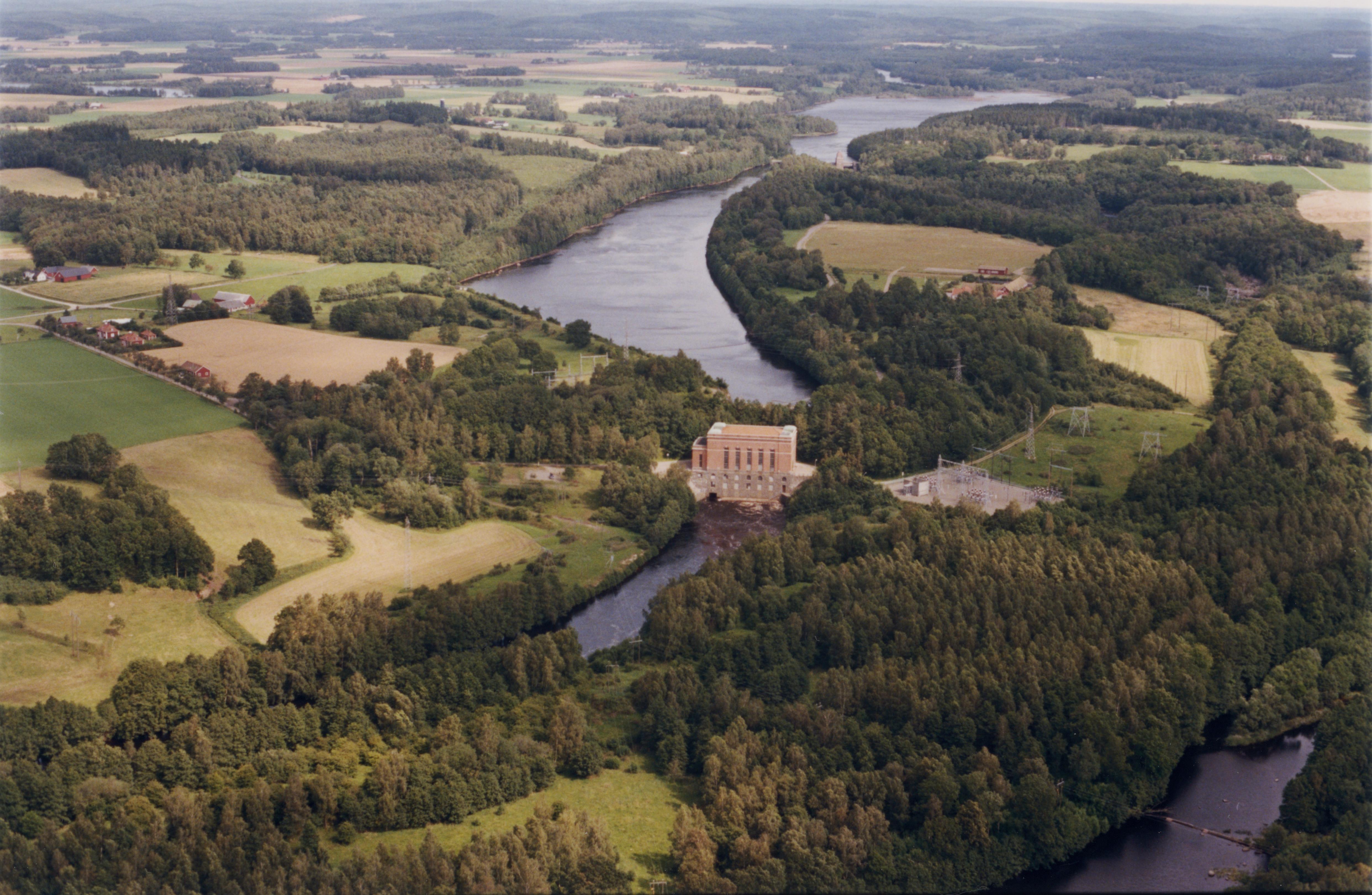 Beskrivning: Karsefors kraftverk (västra delen) i ån Lågan. Bilden är tagen mot (väderstreck): NO