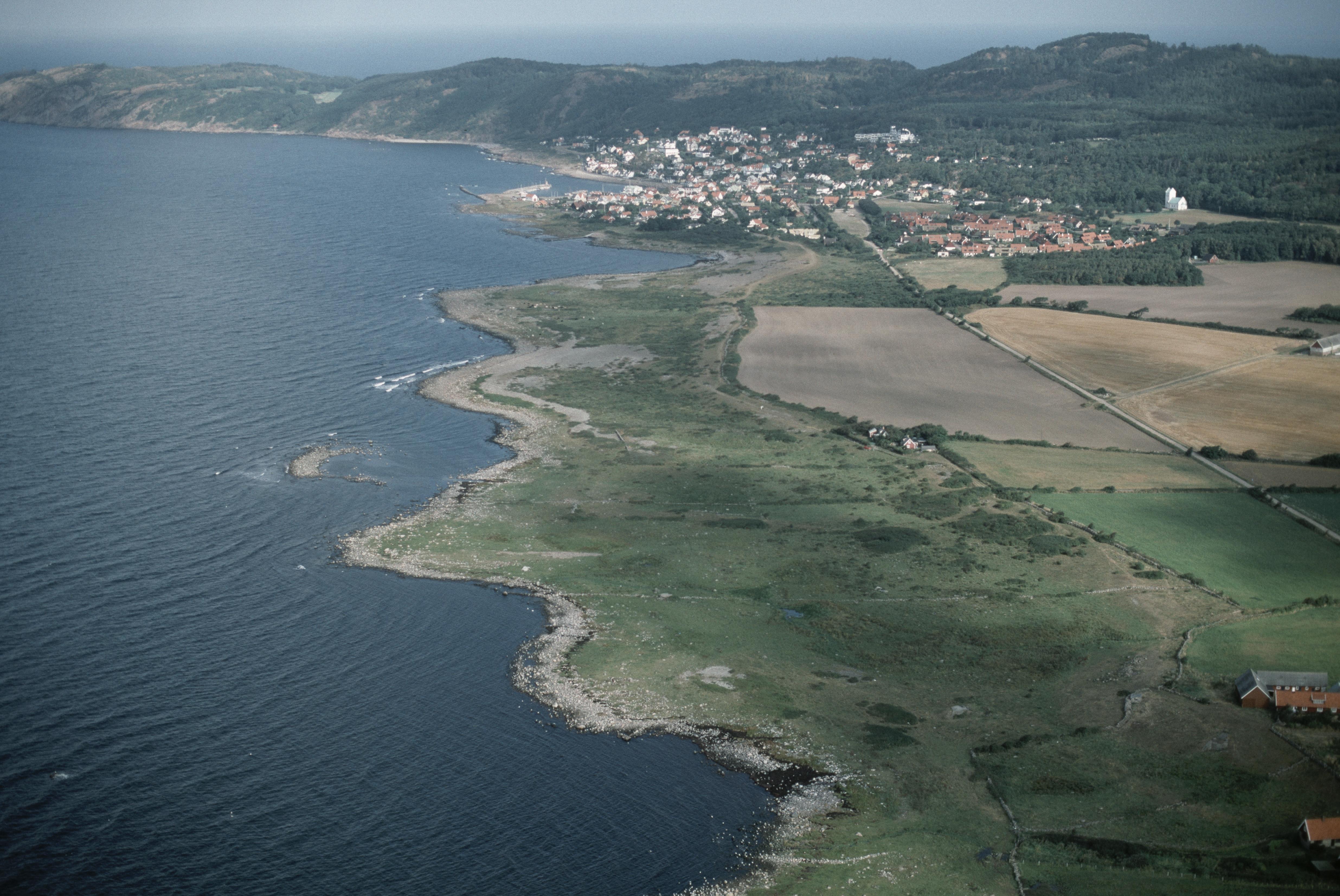 Beskrivning: Kullaberg, sydvästra delen vid Vattenmöllan/Möllehässle. Vid bildens mitt kar vid stranden och rösen Brunnby 247:1-2. Mölle tätort med Mölle kapell i bildens övre del. Bilden är tagen mot (väderstreck): NNV
