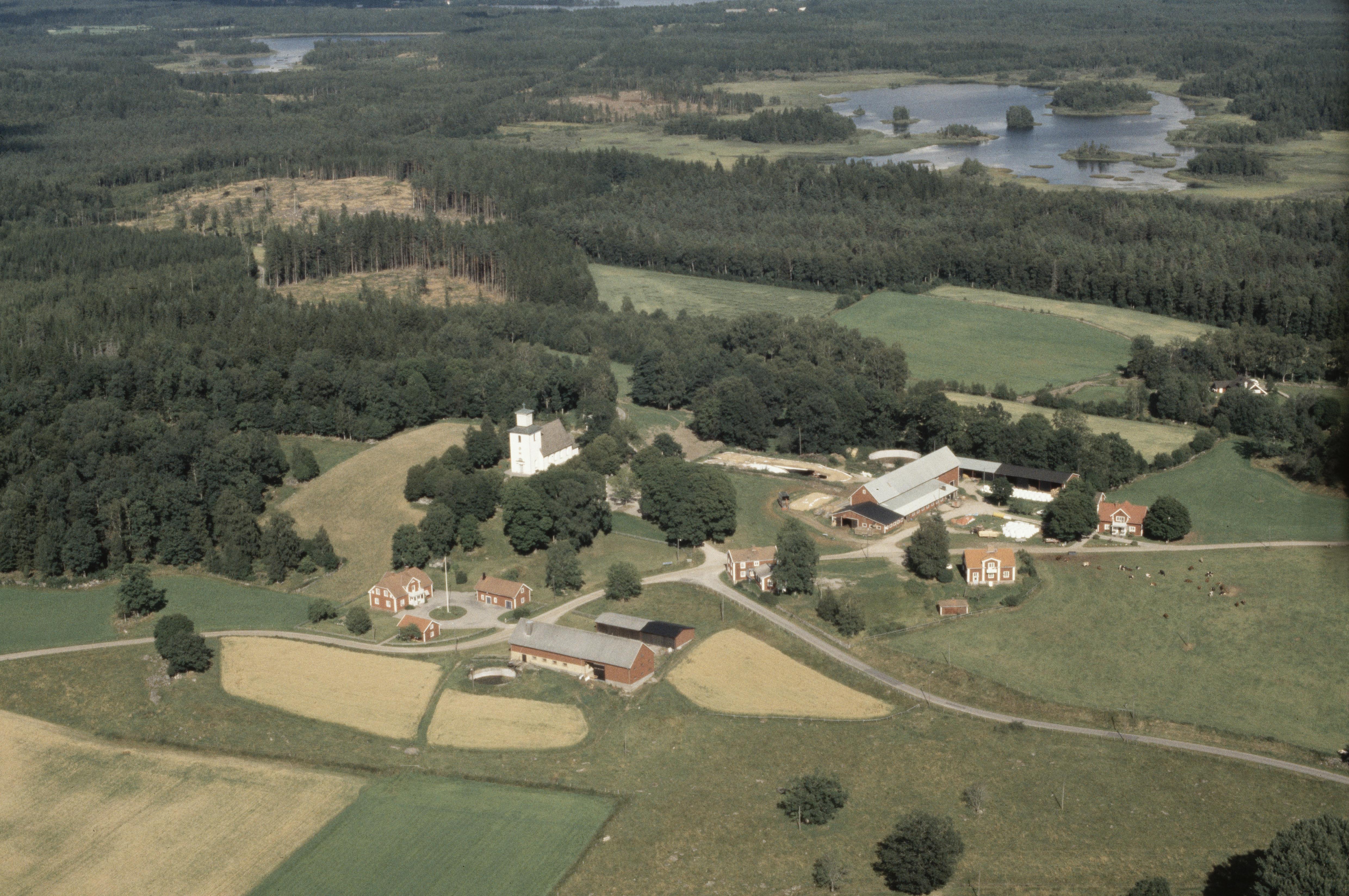 Beskrivning: Ormesberga kyrka och kyrkby. Vid bildens mitt bytomt RAÄnr Ormesberga 55:1. Bilden är tagen mot (väderstreck): NO