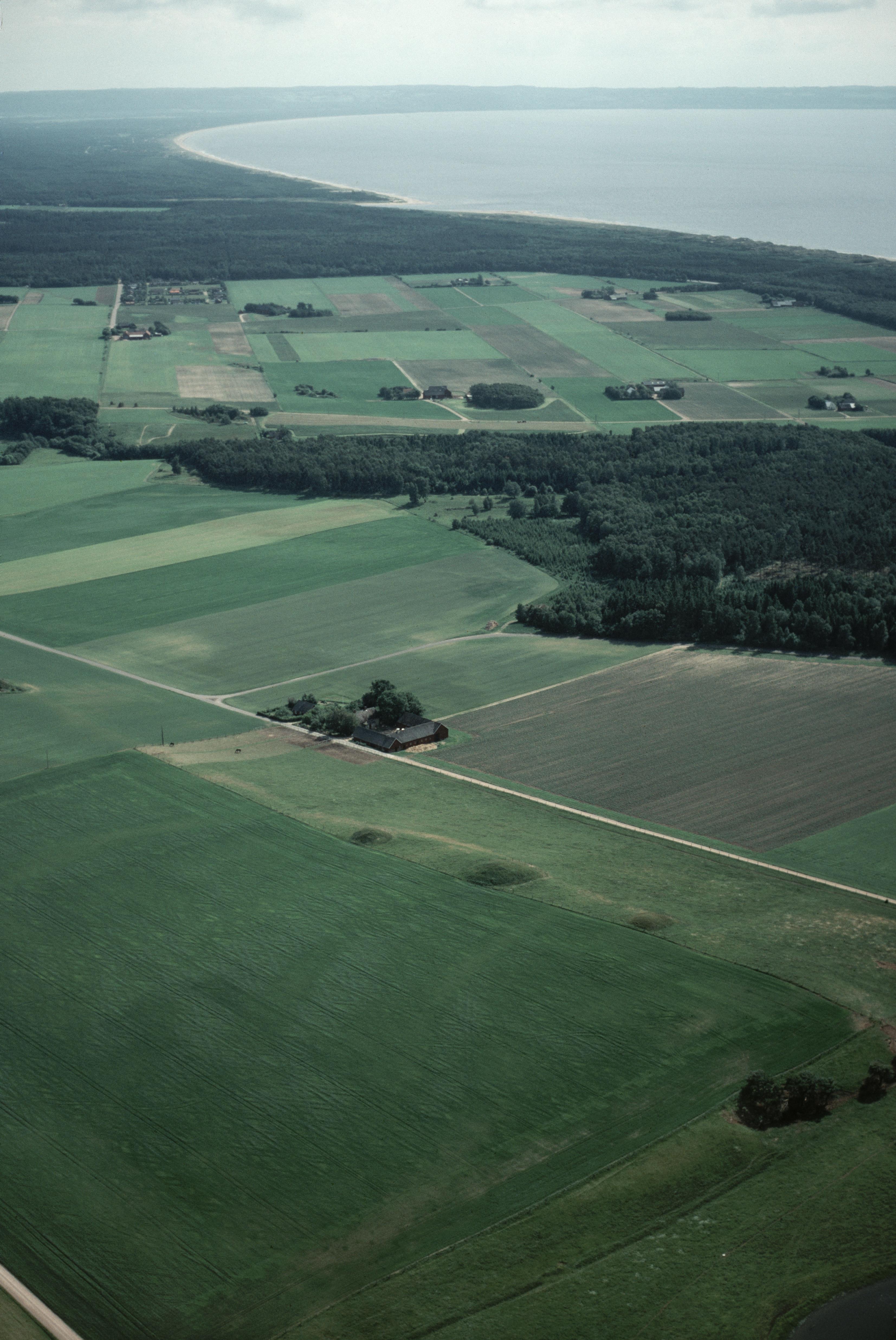 Beskrivning: Gravhögar RAÄnr Eldsberga 2:1, 3:1, 4:1 m.fl. vid bildens mitt. I bildens övre del Laholmsbuktens naturreservat. Bilden är tagen mot (väderstreck): SV