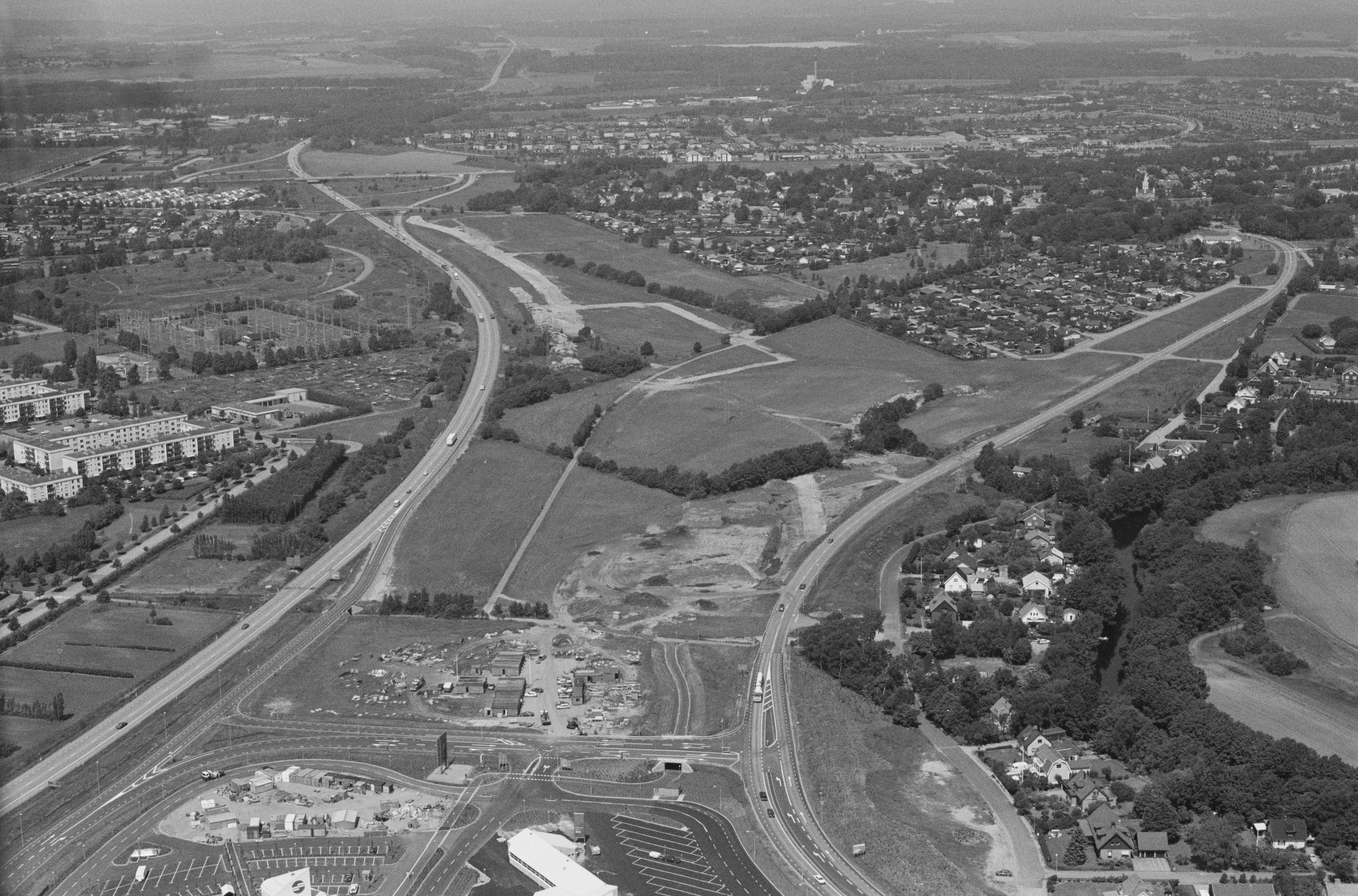 Beskrivning: Östra delen av staden Halmstad. Väg E6 vid Fyllinge på gränsen mellan socknen Halmstad (till v.) och Snöstorp (till h.) Snöstorp kyrka uppe till höger. Bilden är tagen mot (väderstreck): N