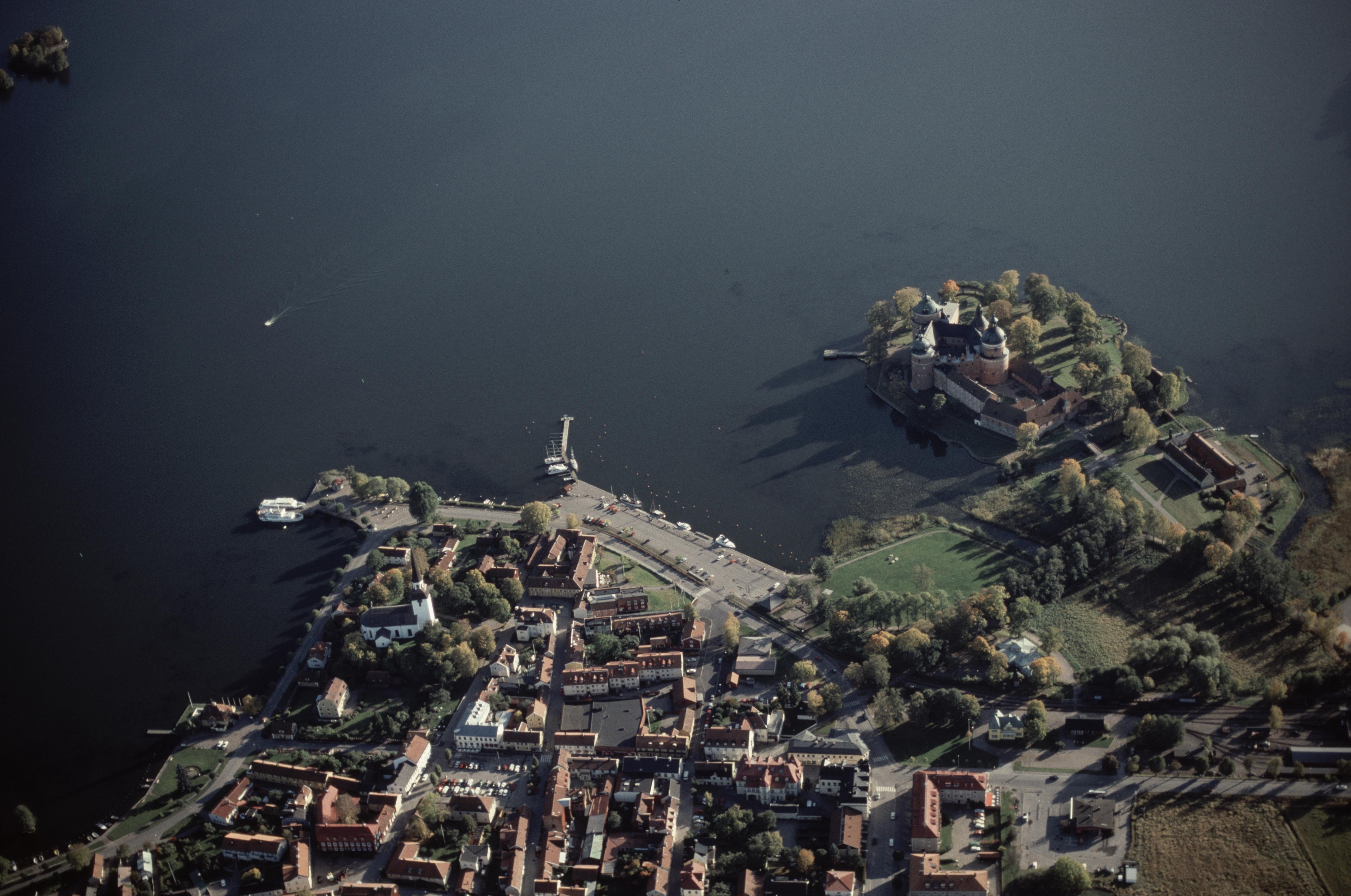 Beskrivning: Mariefreds stad vid gränsen till Kärnbo socken (i bildens högra del). Mariefreds kyrka till vänster. Gripsholms slott uppe till höger. Bilden är tagen mot (väderstreck): SV